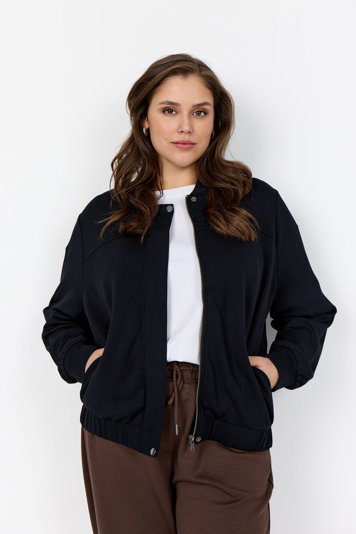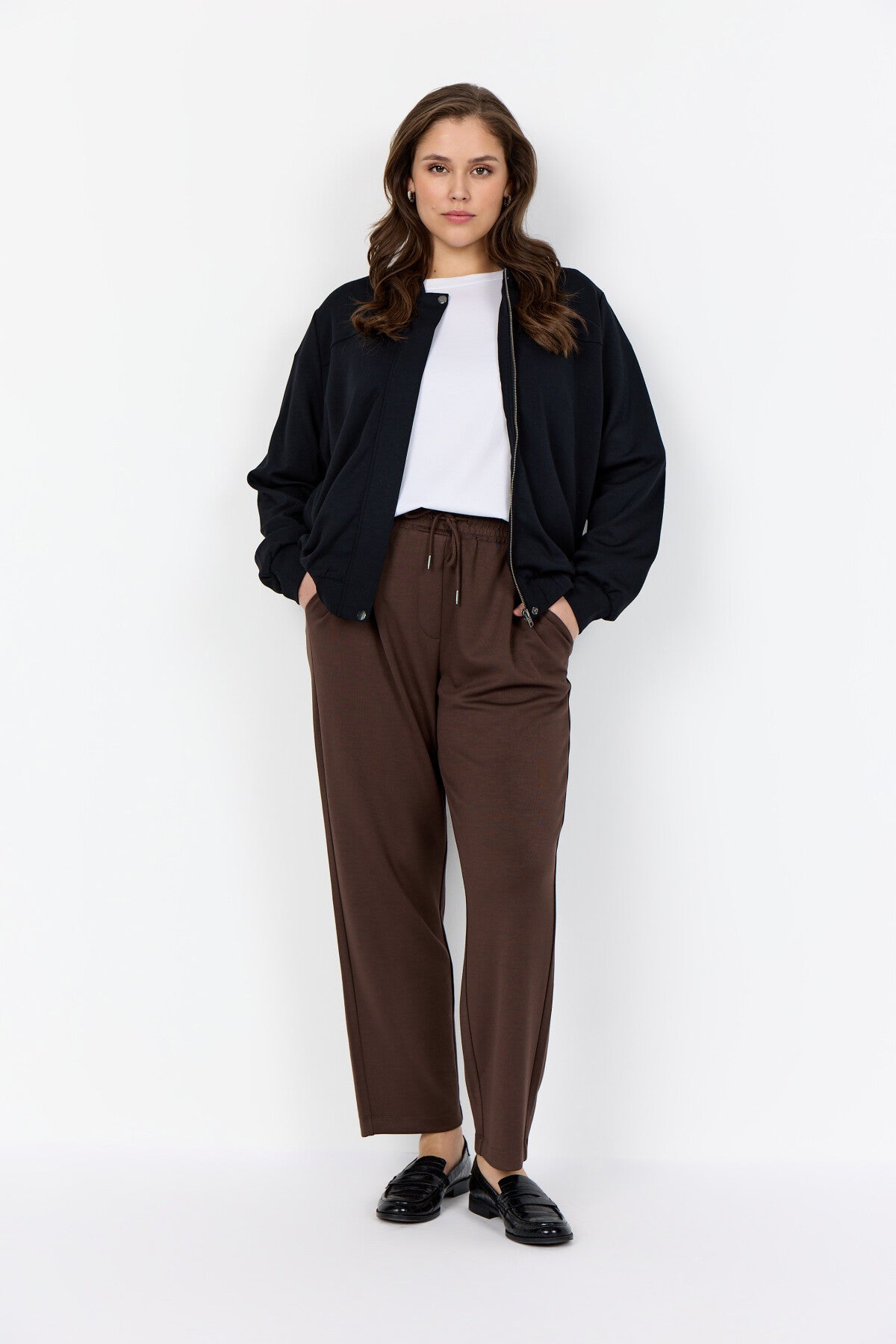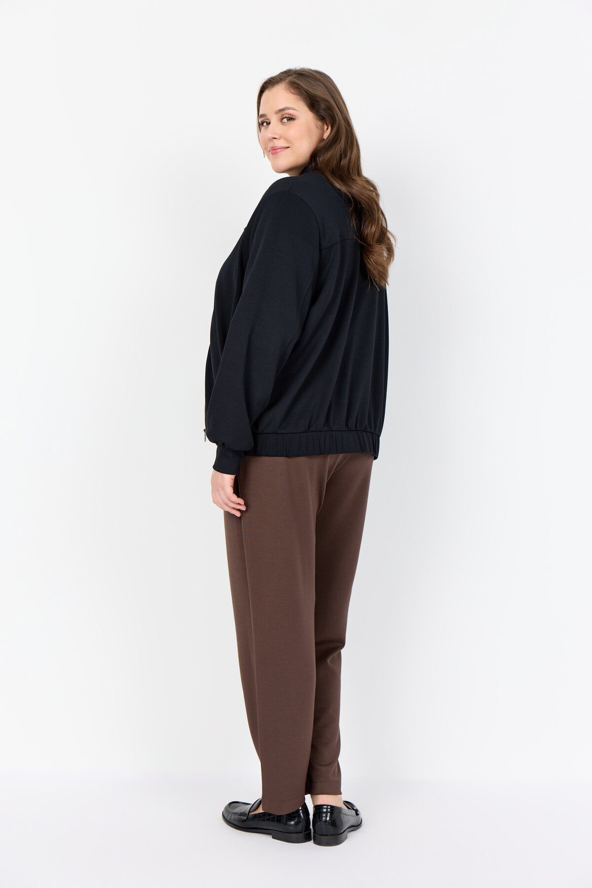 Bella är 176 cm hög och bär en str. 46