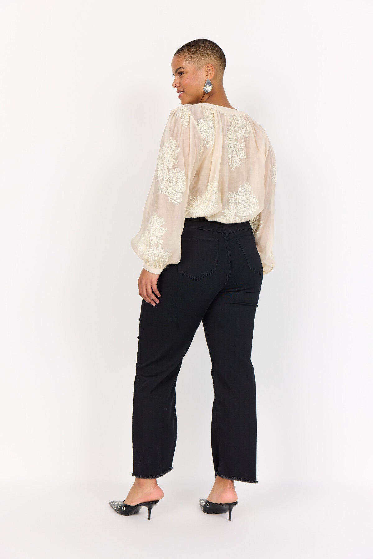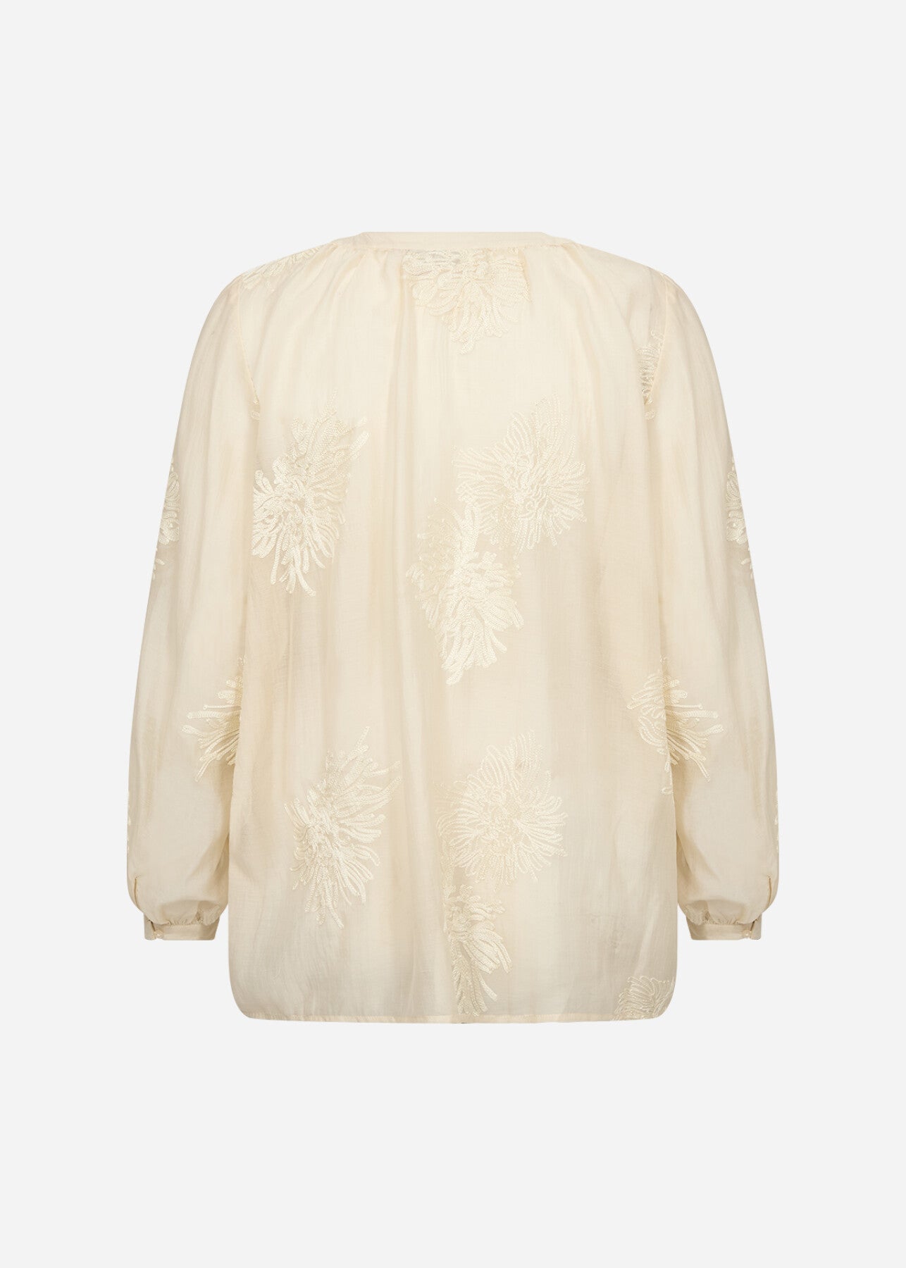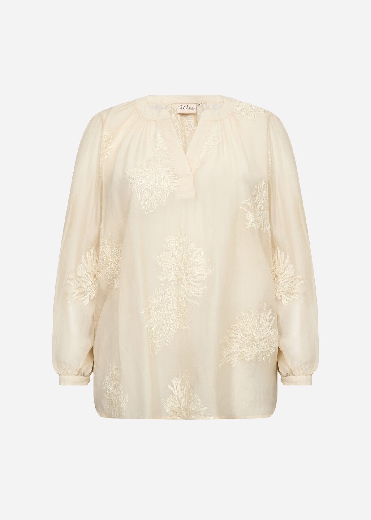 WA-SILICIA 1 är en blus tillverkad av 75% viskos och 25% nylon. Den har ett elegant blomsterbroderi, en subtil v-ringning och manschetter. Matcha den med skräddarsydda byxor eller en kjol för en elegant look.