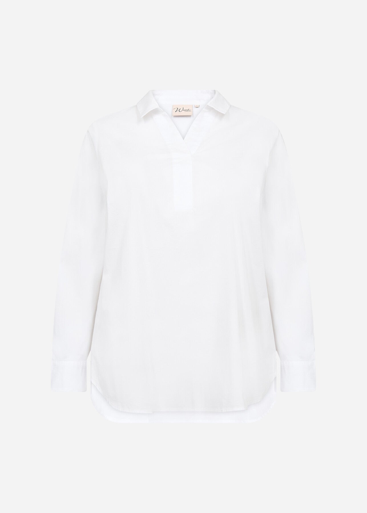 WA-SAGA 9 är en blus tillverkad av 68% ekologisk bomull, 27% polyamid och 5% elastan. Denna eleganta blus har en V-ringad krage och slät textur, med en avslappnad passform som draperar vackert. Styla den med skräddade byxor eller en kjol för en cool look.
