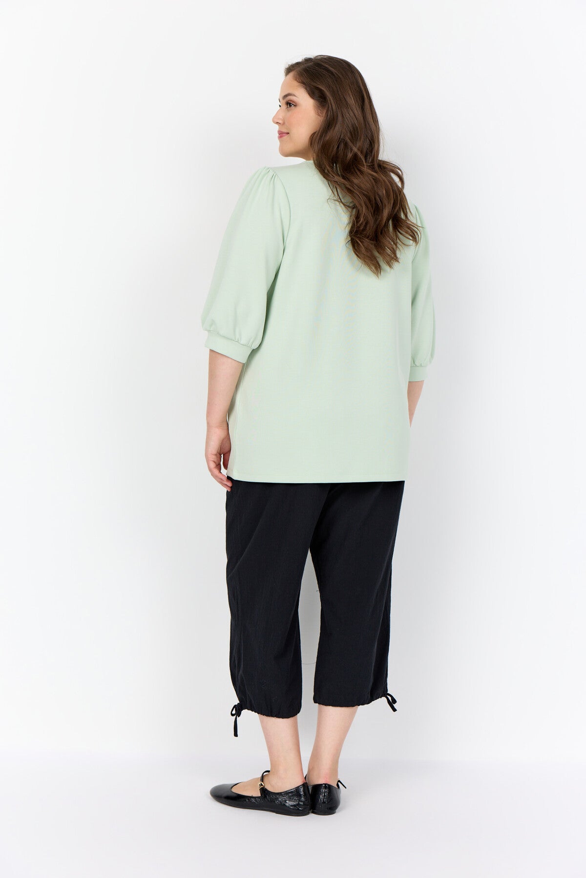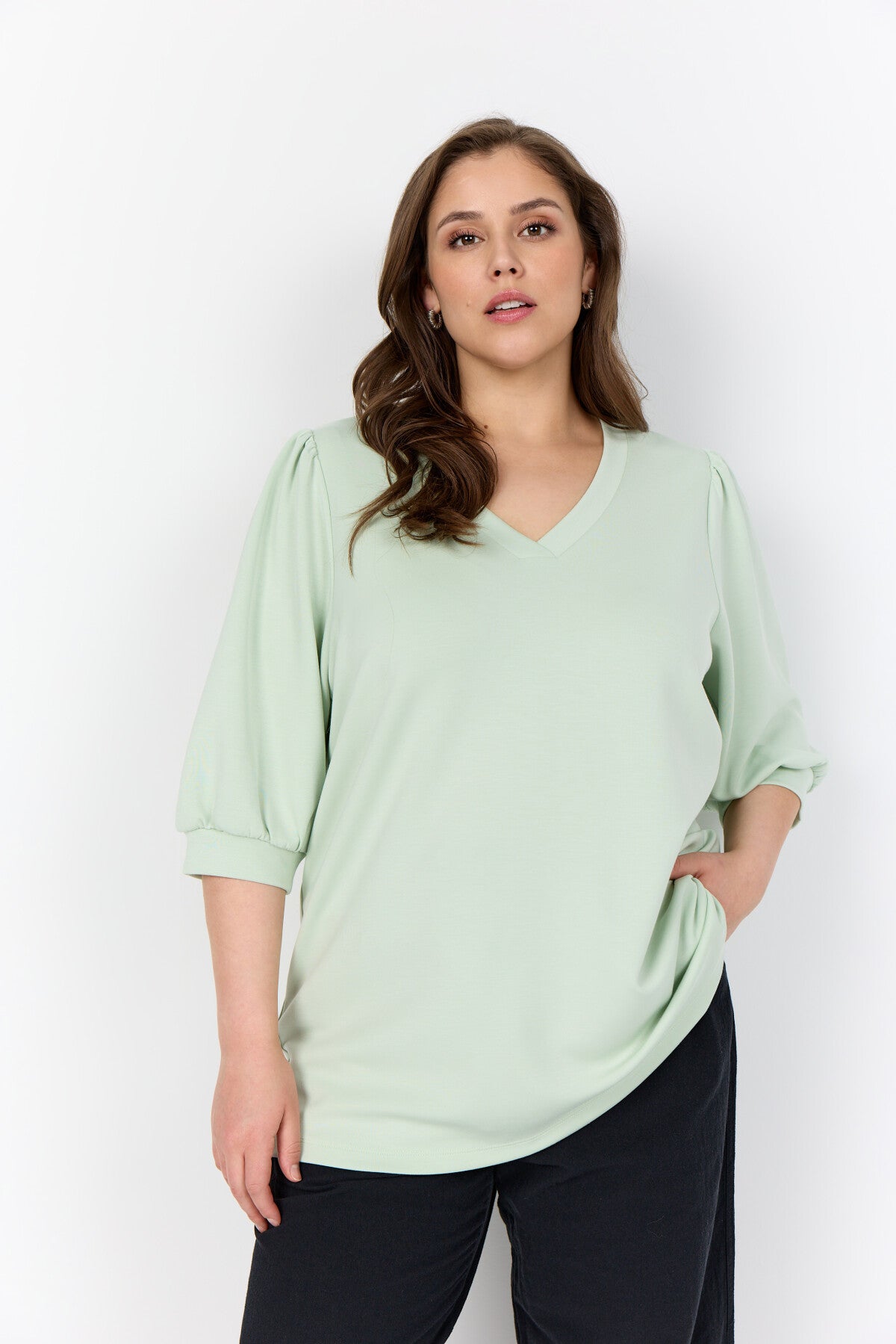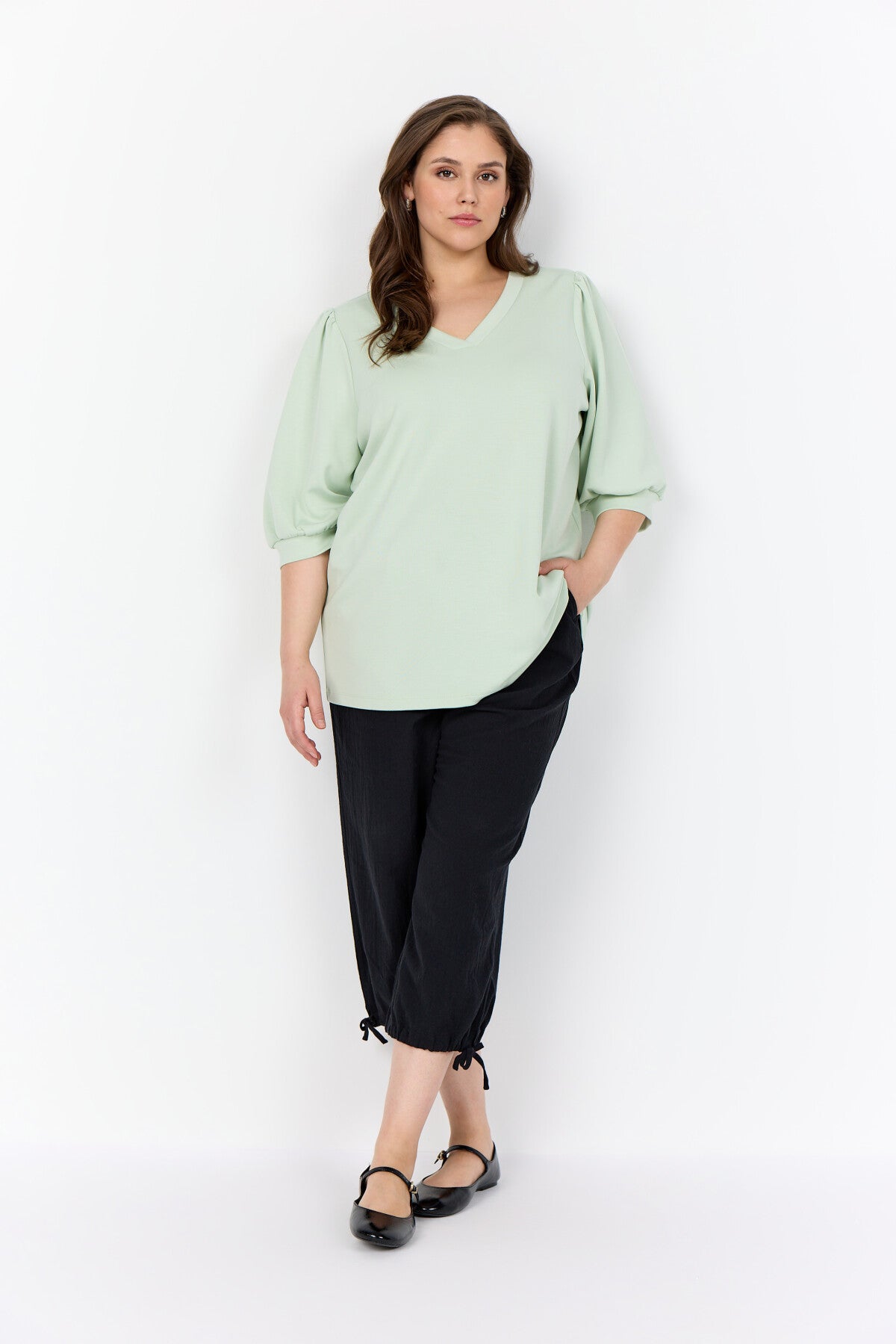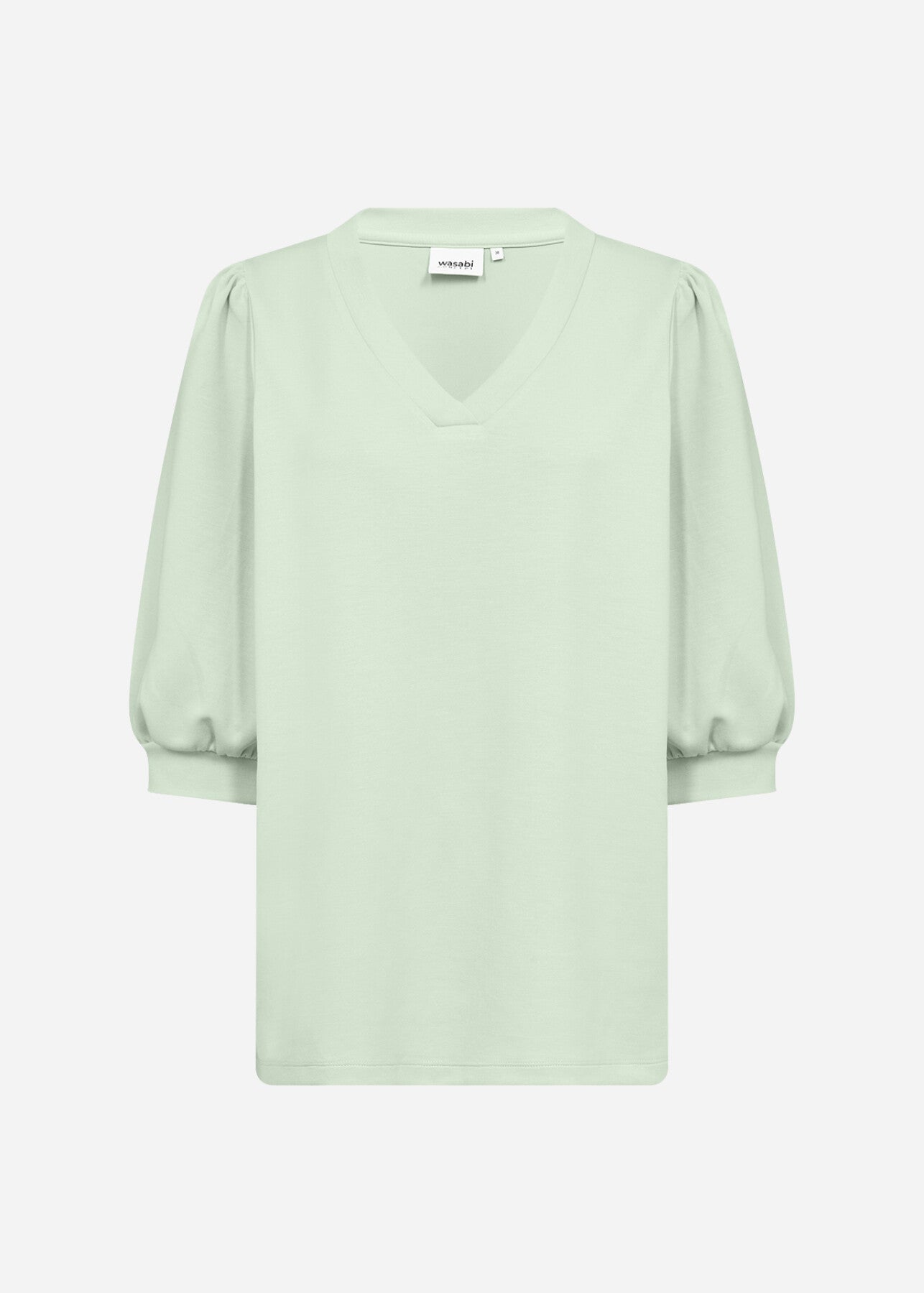 WA-SABINA 8 är en feminin blus tillverkad av 48% modal, 48% polyester, 4% elastan. Blusen har en smickrande V-ringning, halvärmar med en lätt puff och ribbade muddar. Matcha den med skräddarsydda byxor för en elegant kontorslook eller bär den med jeans för en cool, avslappnad stil.