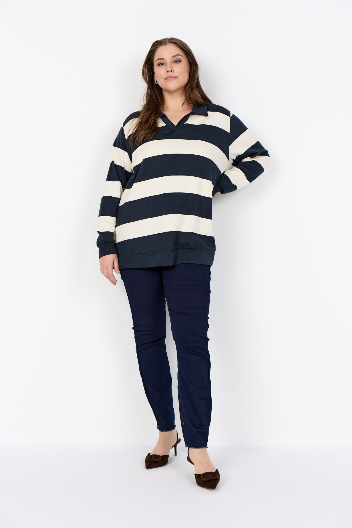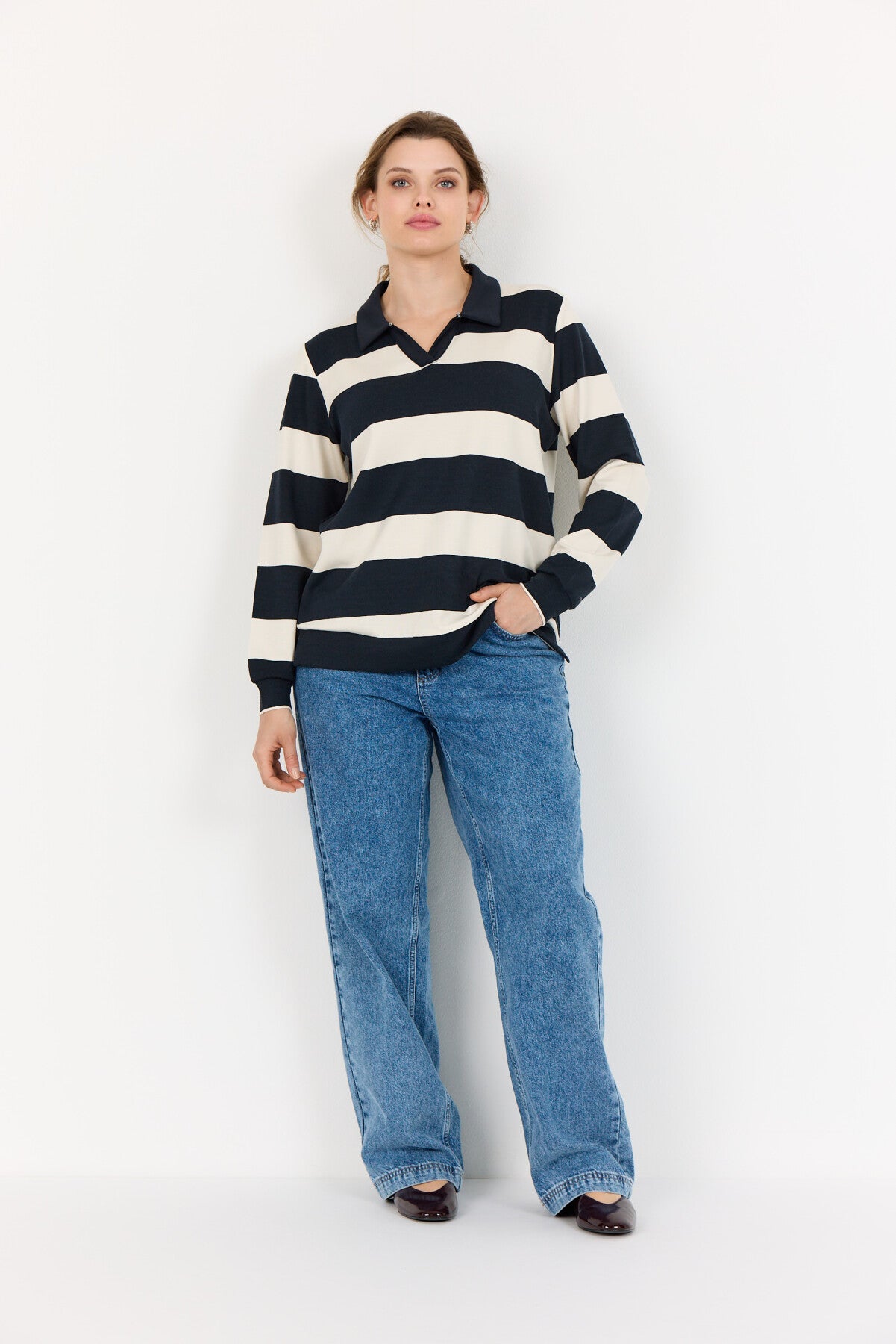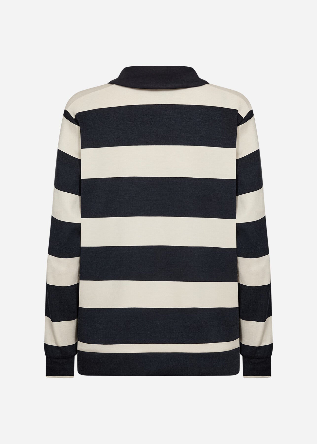WA-CHALINE 2 är en cool sweatshirt tillverkad av 48% modal, 48% polyester och 4% elastan. Denna eleganta design har en V-ringning, en klassisk krage och djärva horisontella ränder, vilket skapar en slående look. Kombinera den med jeans eller linnebyxor med lös passform för en avslappnad men snygg outfit.