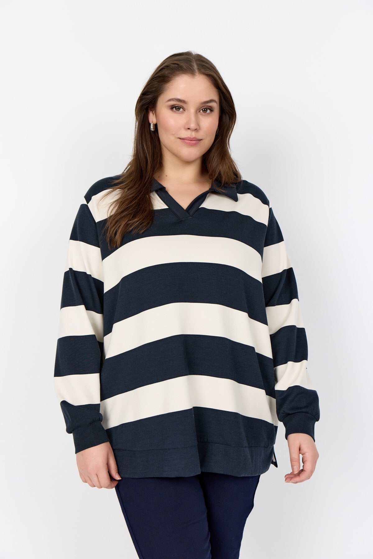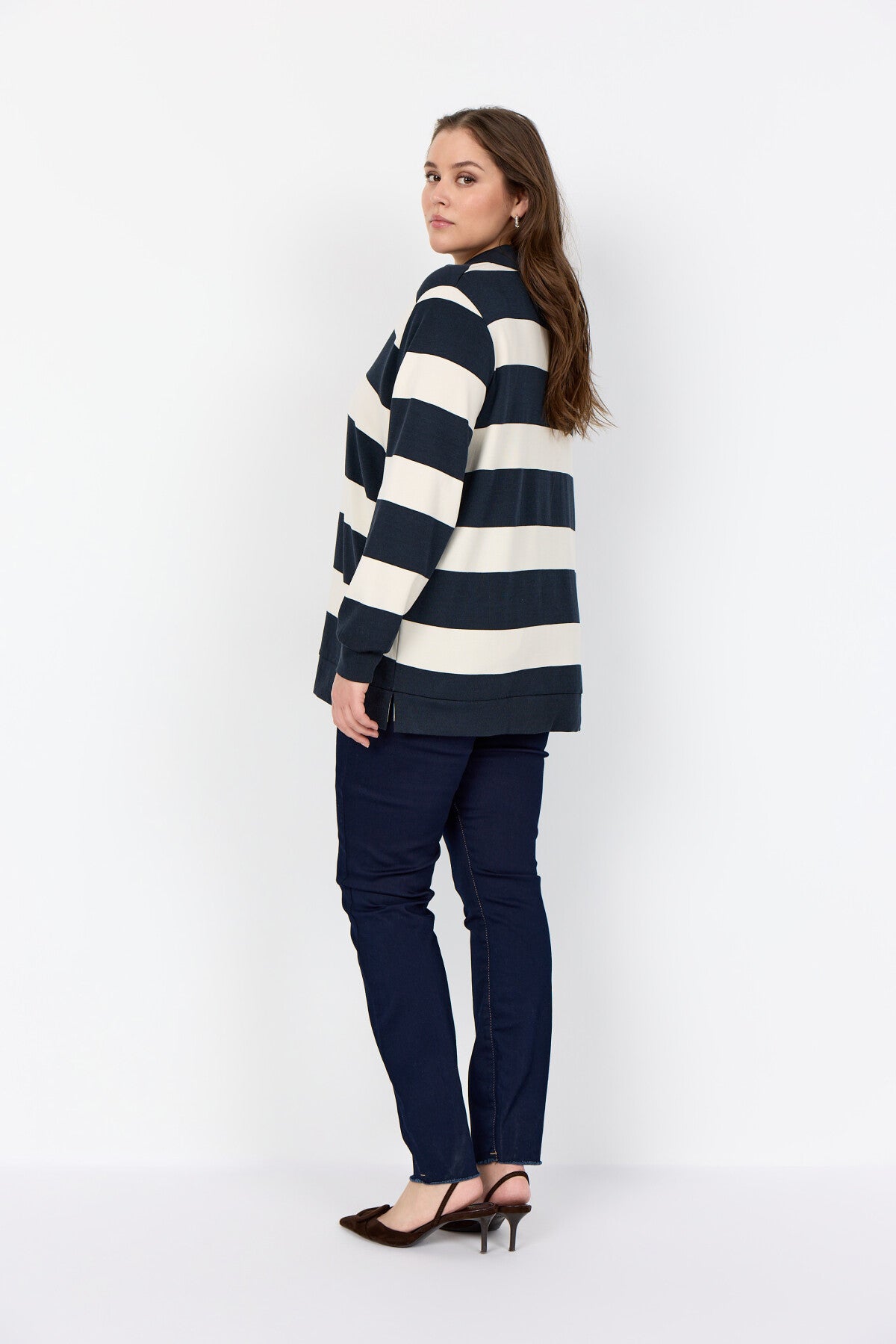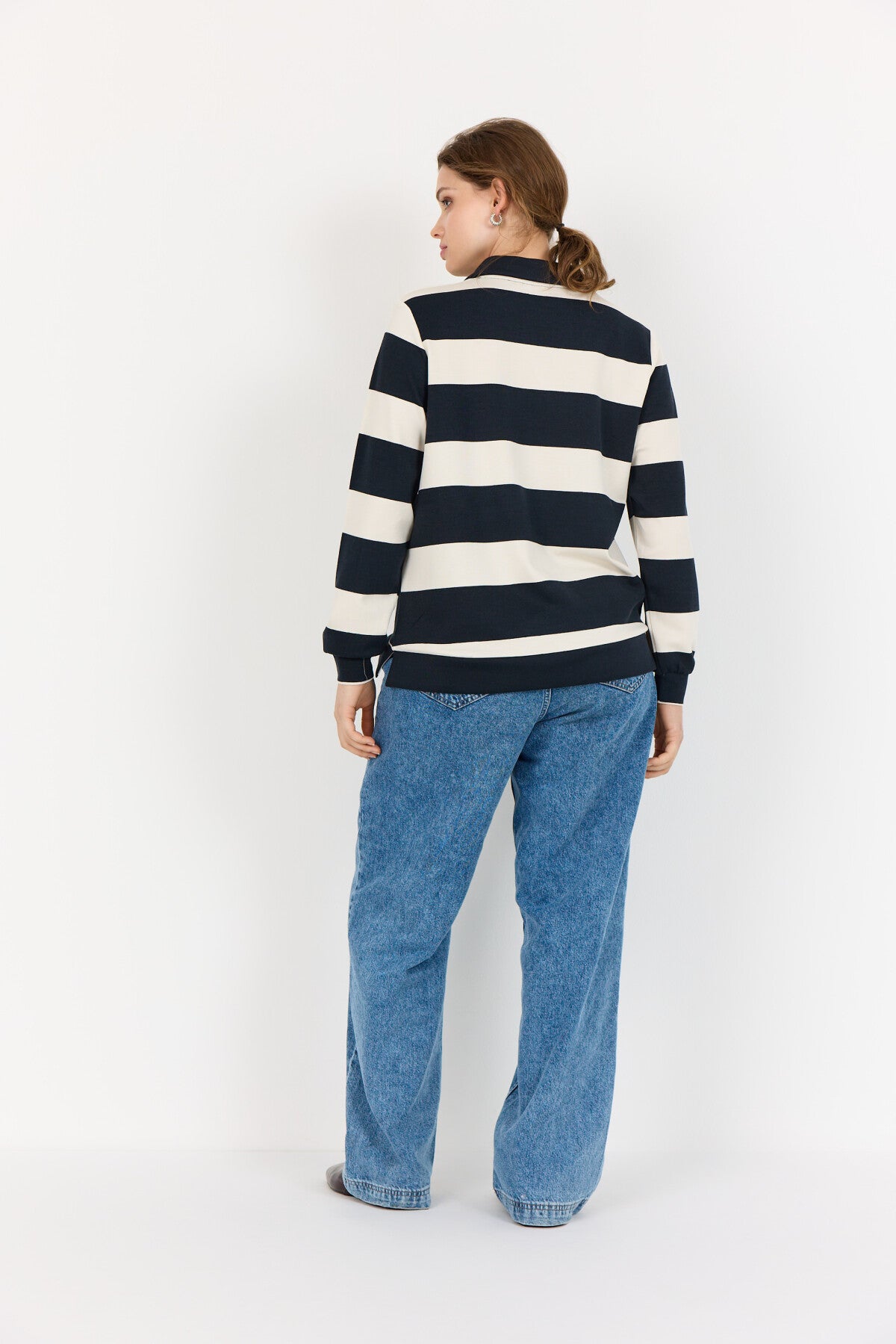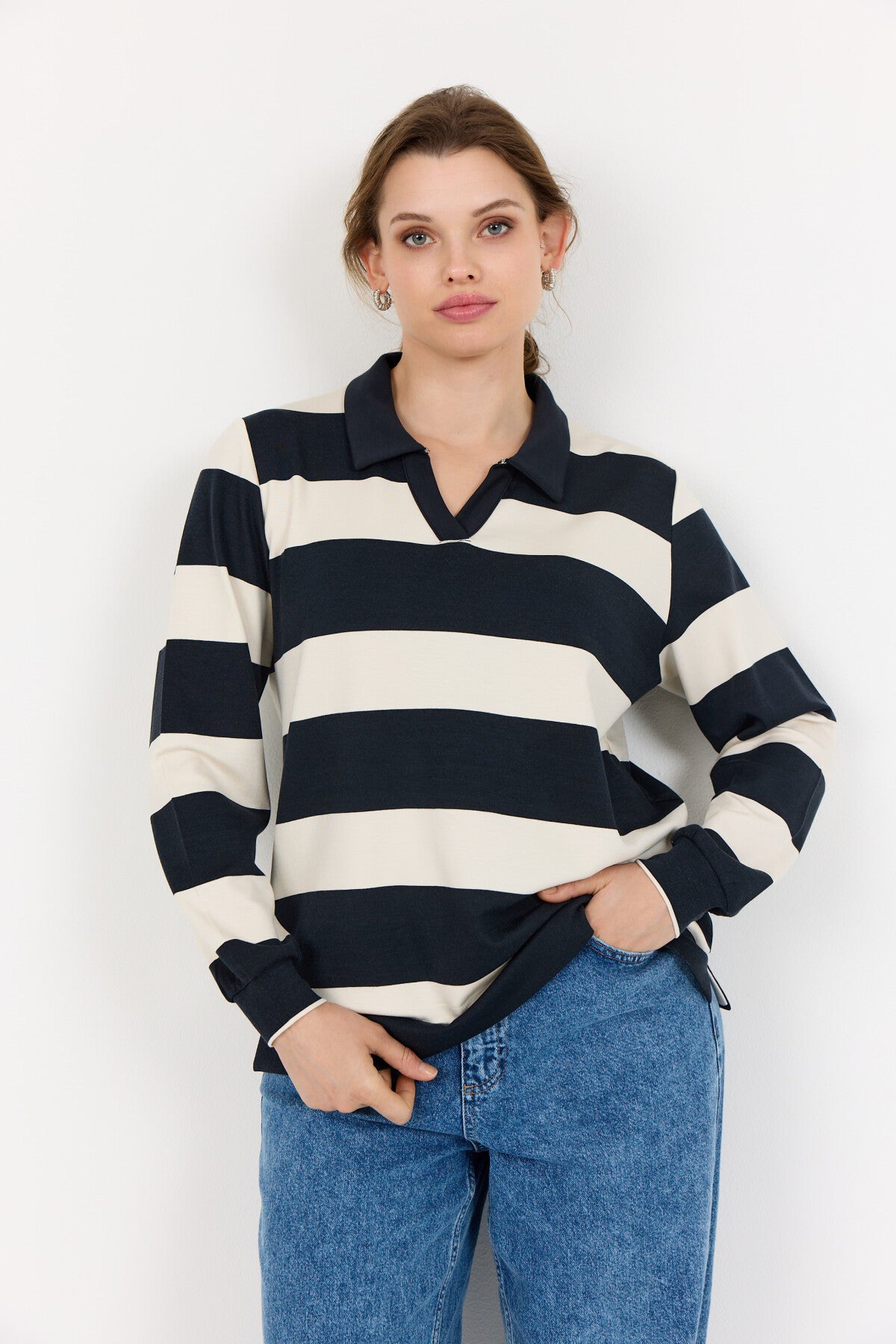 WA-CHALINE 2 är en cool sweatshirt tillverkad av 48% modal, 48% polyester och 4% elastan. Denna eleganta design har en V-ringning, en klassisk krage och djärva horisontella ränder, vilket skapar en slående look. Kombinera den med jeans eller linnebyxor med lös passform för en avslappnad men snygg outfit.