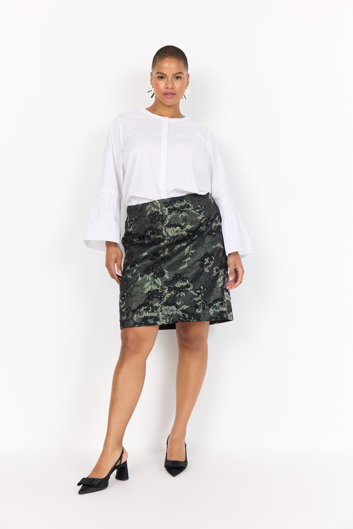 WA-SEVIL 2 är en kjol tillverkad av 90% återvunnen polyester, 10% metallic. Denna eleganta minikjol har ett blommigt tryck med textur och en enkel silhuett. Kombinera den med en krispig blus eller en figurnära topp för en elegant look.