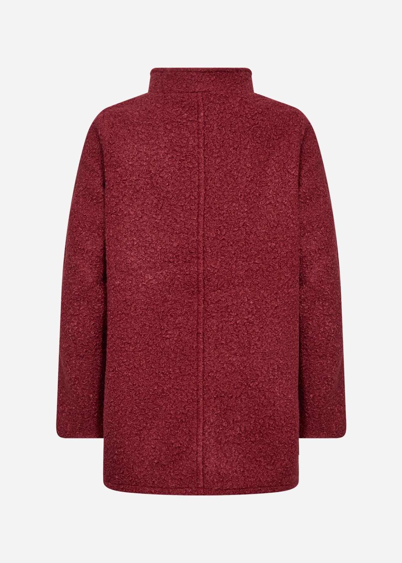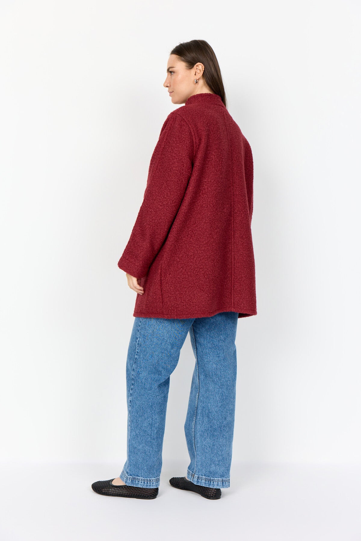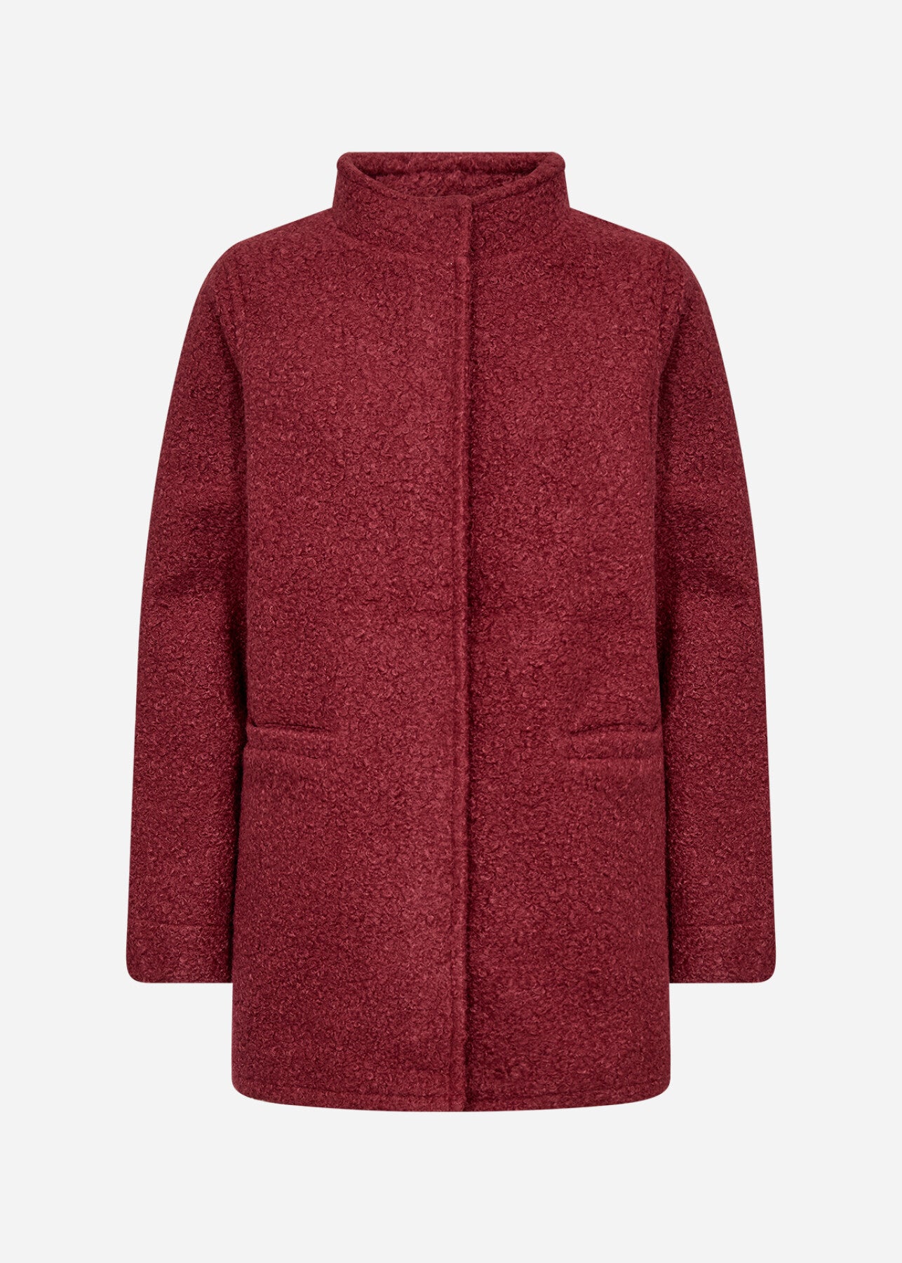 WA-LUCY 3 är en kavaj tillverkad av 100% återvunnen polyester. Den har en hög krage, dolda knappar, medellång längd och ett texturerat tyg. Kombinera den med skräddarsydda byxor och stövlar för en elegant look.
