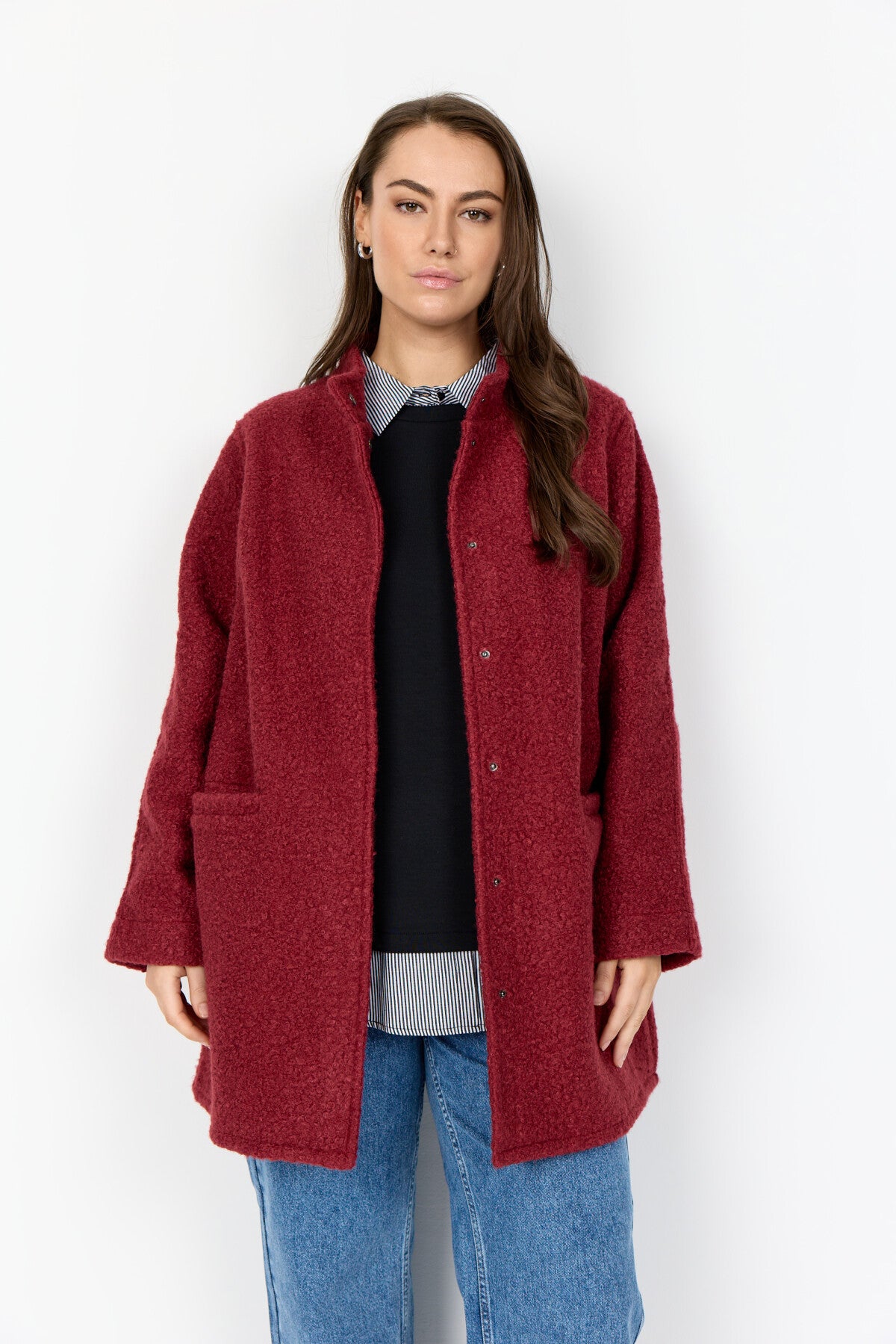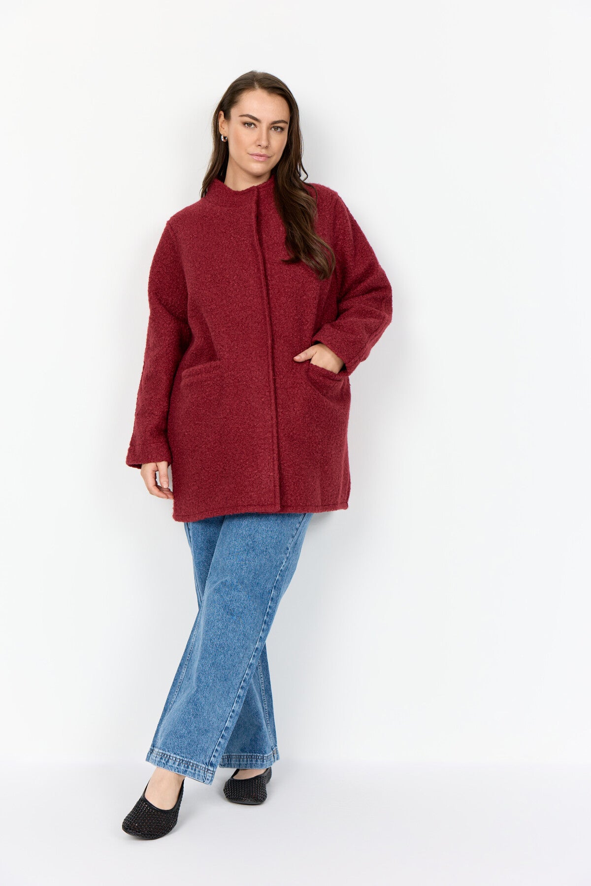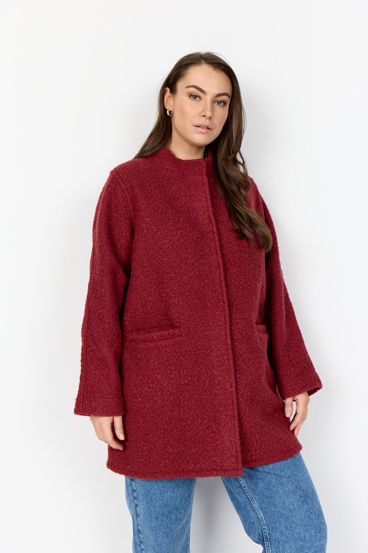 WA-LUCY 3 är en kavaj tillverkad av 100% återvunnen polyester. Den har en hög krage, dolda knappar, medellång längd och ett texturerat tyg. Kombinera den med skräddarsydda byxor och stövlar för en elegant look.