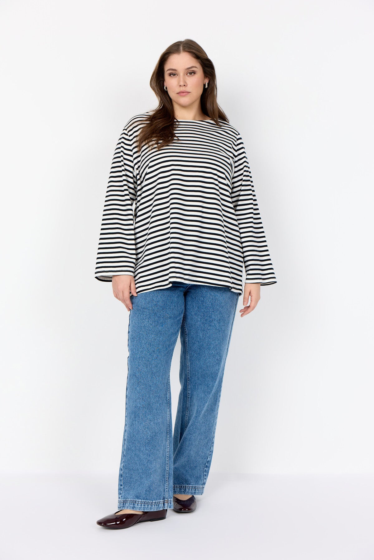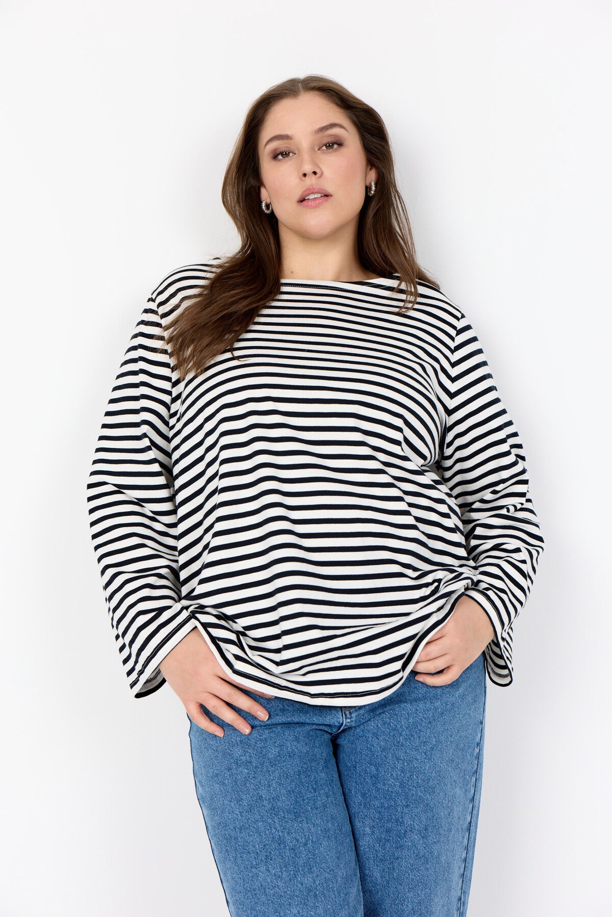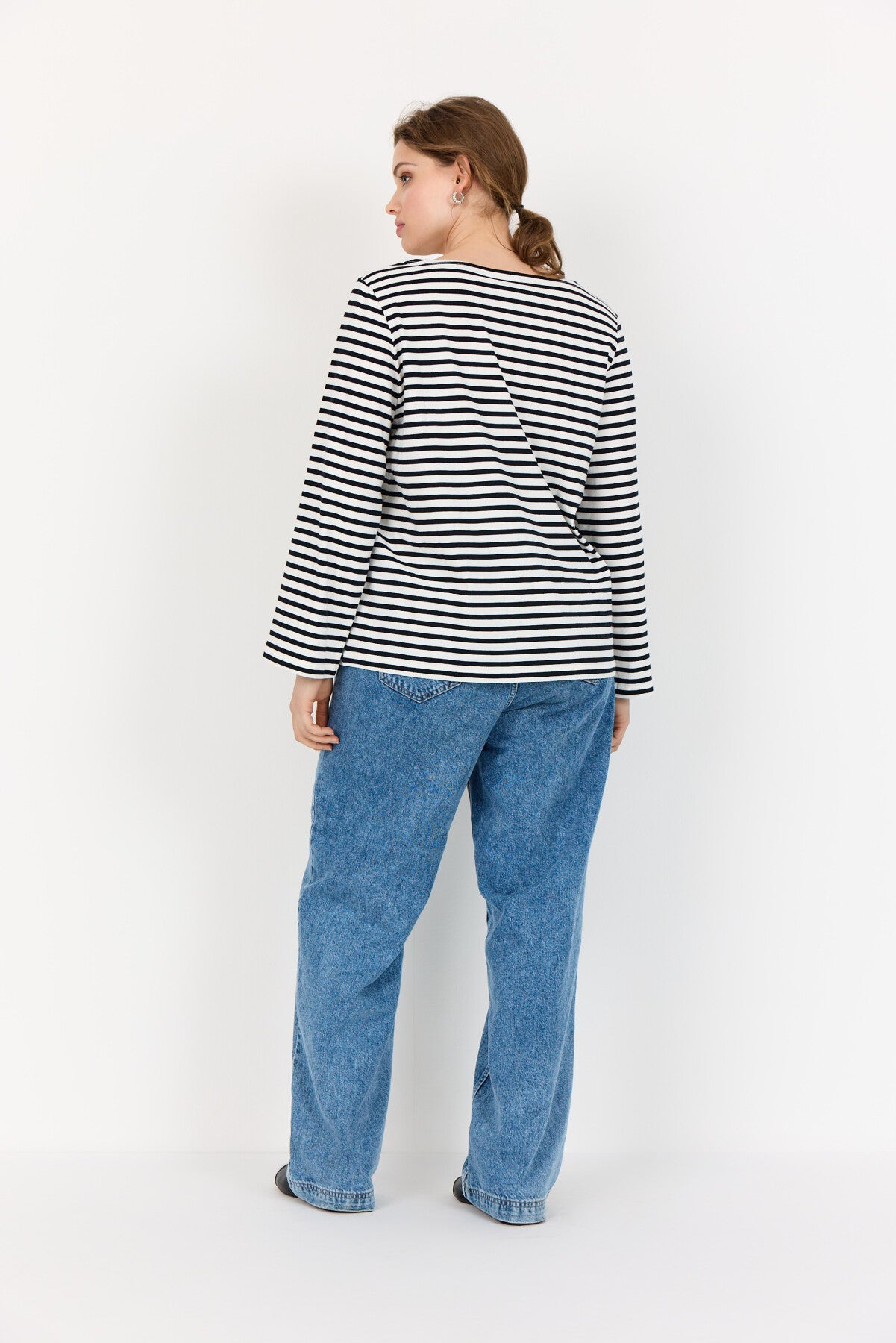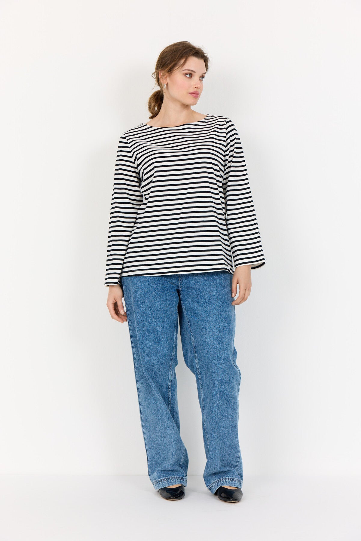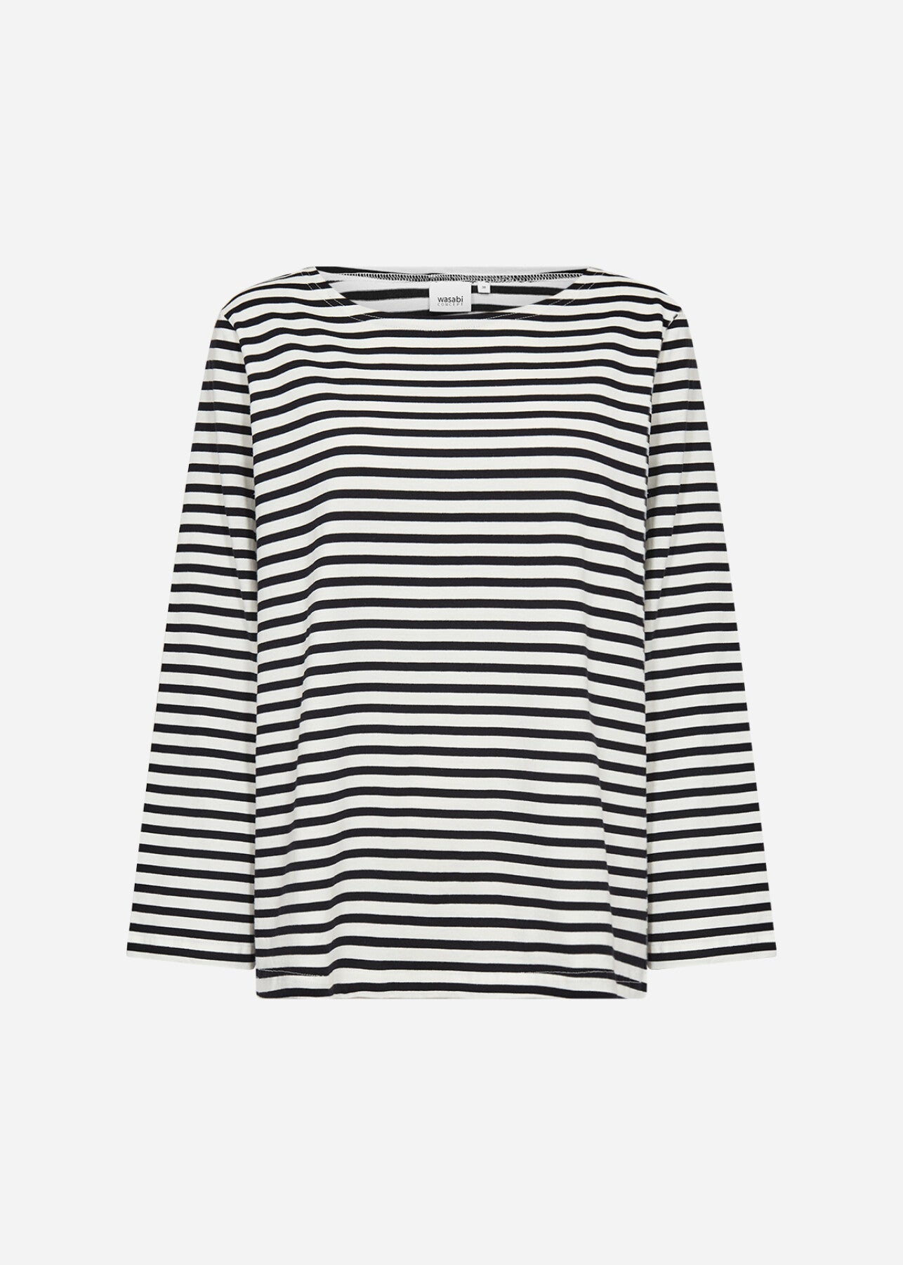 WA-CELESTE 2 är en klassisk T-shirt tillverkad av 100% ekologisk bomull. Den har en klassisk rund halsringning och ett slående randigt mönster med långa ärmar. Matcha den med jeans eller kjol för en avslappnad och cool look.