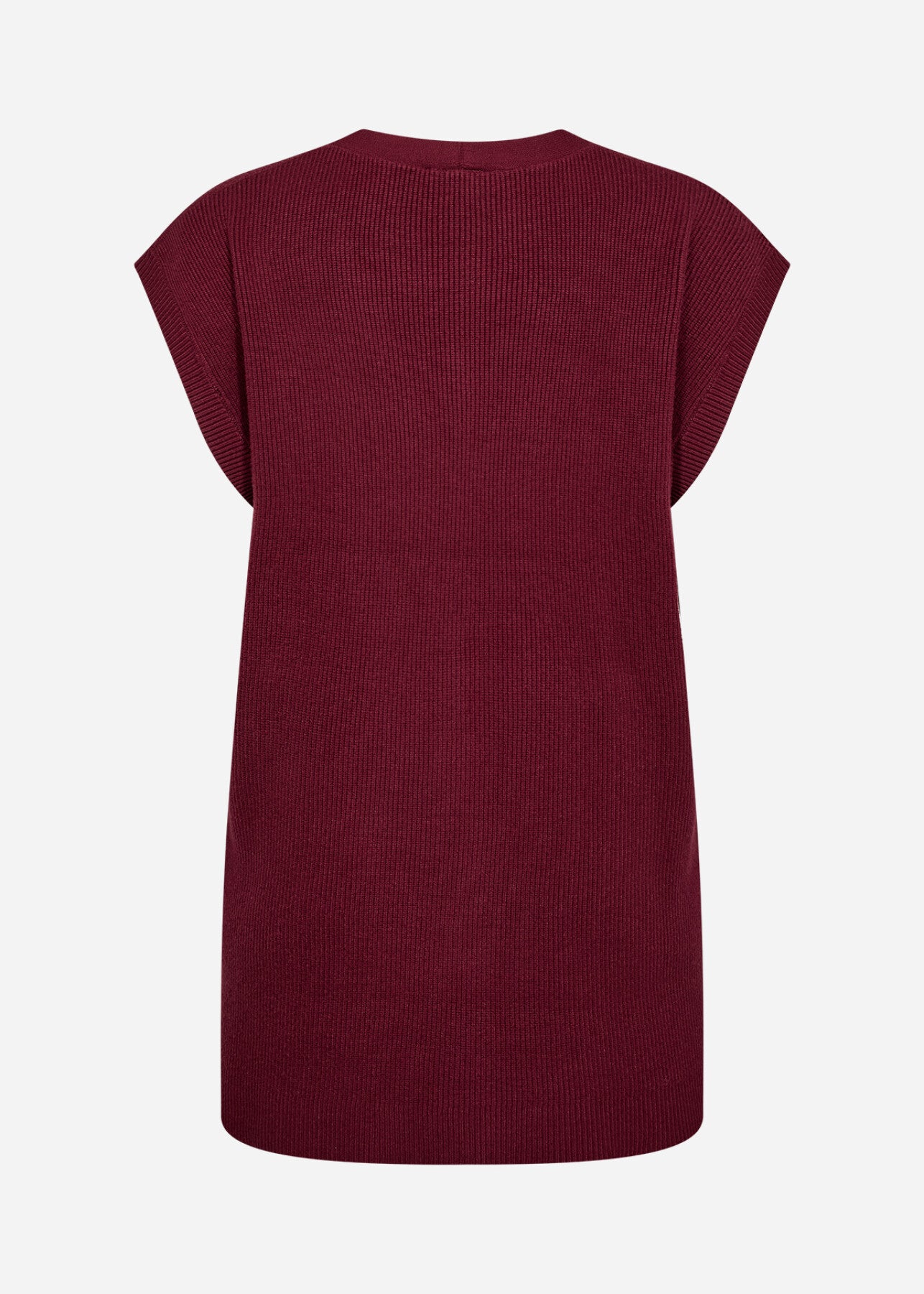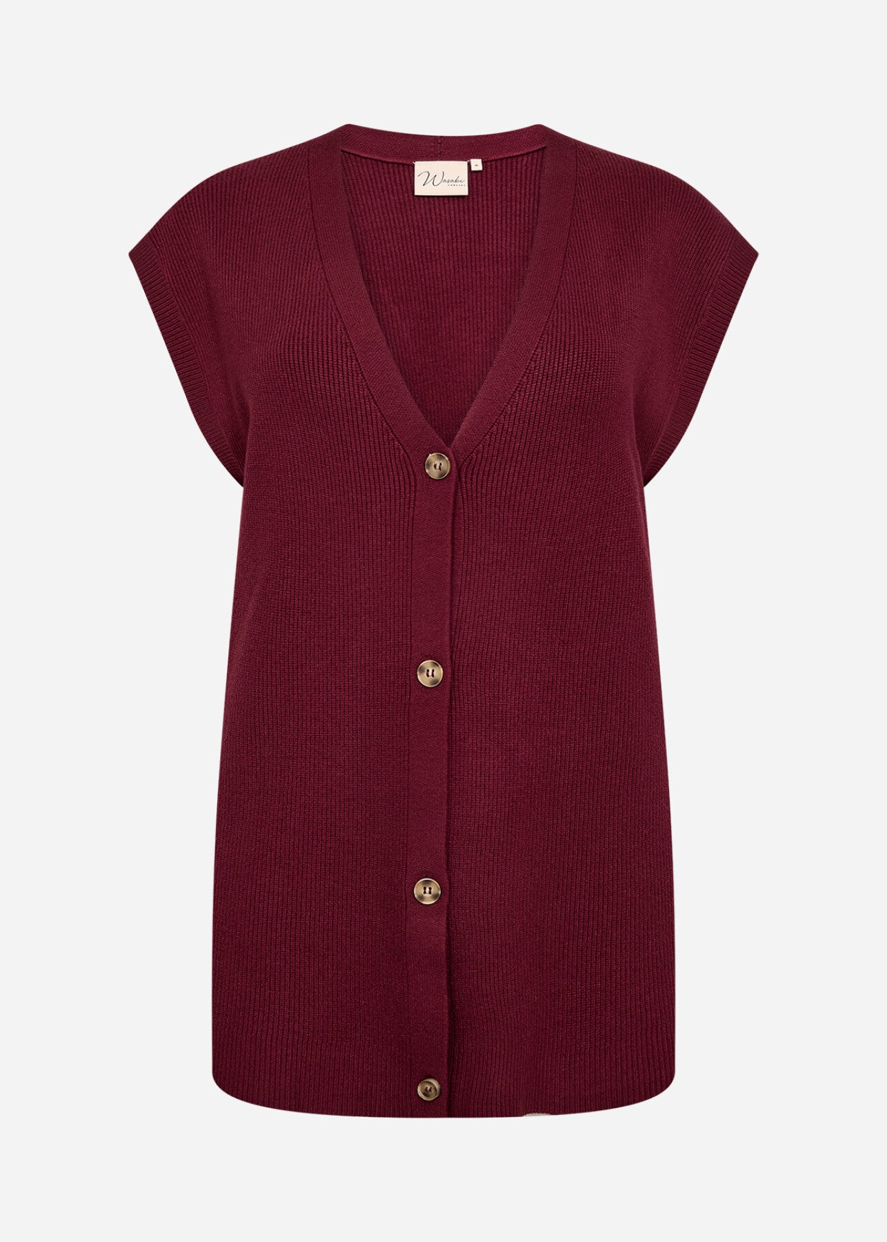 WA-NANINE 1 är en väst tillverkad av 50% LENZING™ ECOVERO™ viskos, 27% polyester och 23% nylon. Den har en V-ringad design med en knappslå framtill och en ribbstickad textur. Bär den över en skjorta eller blus för en lager-på-lager-look.