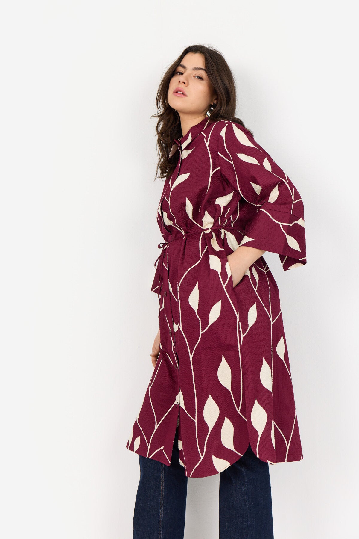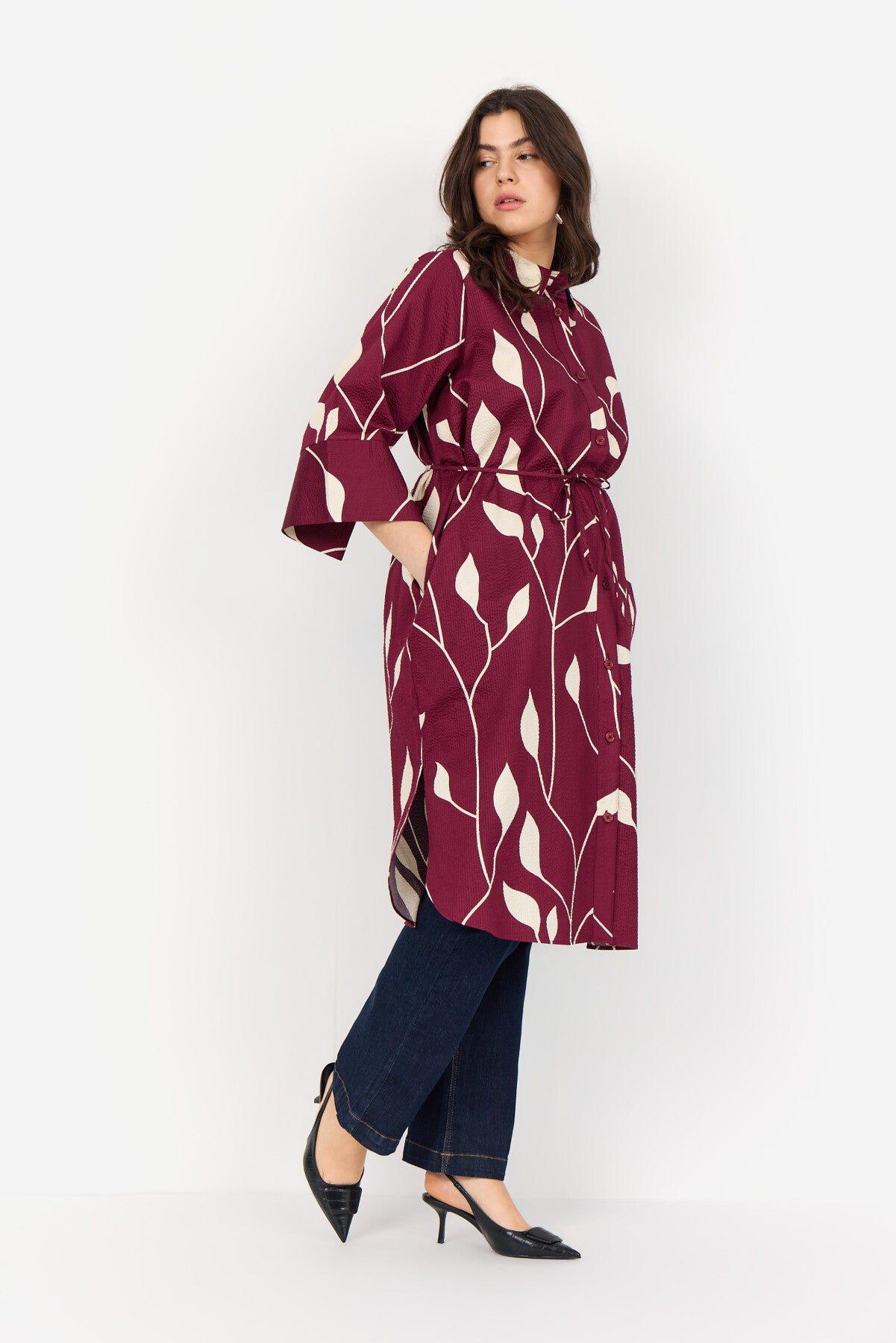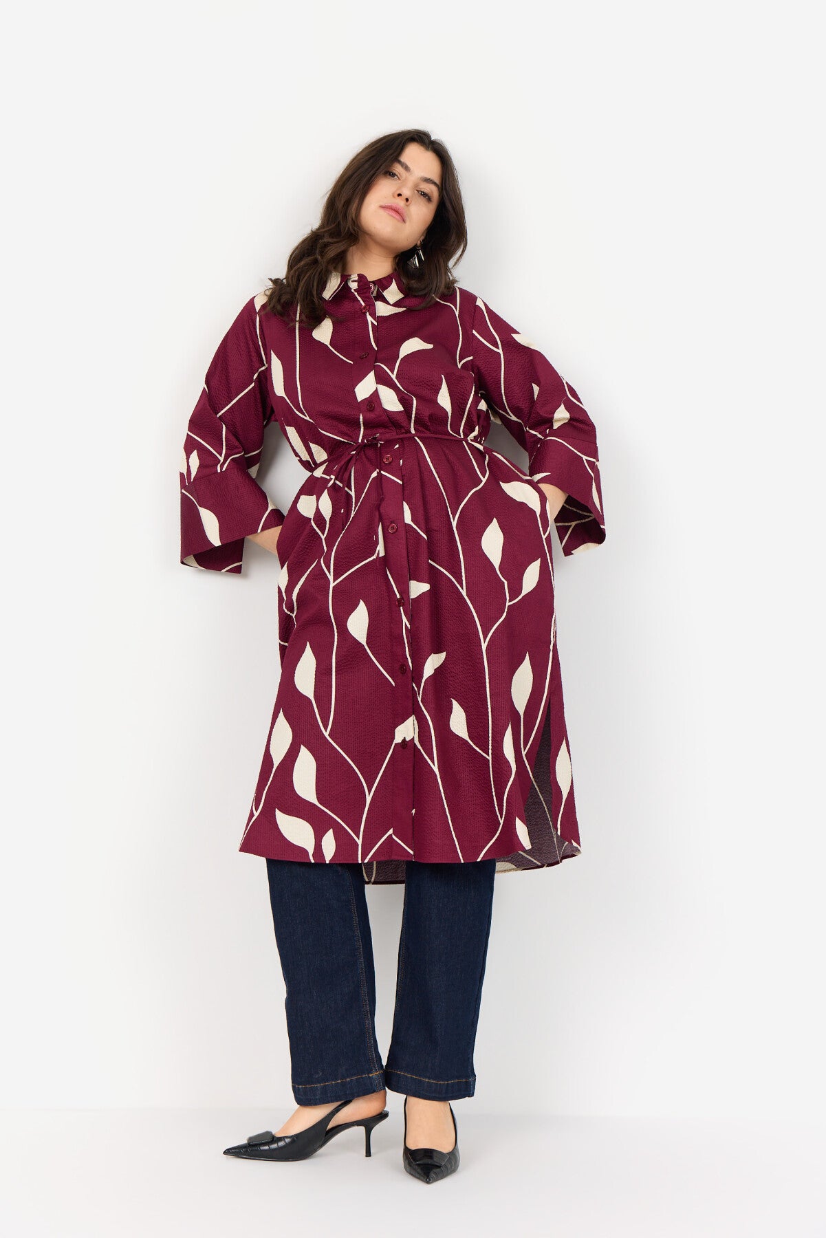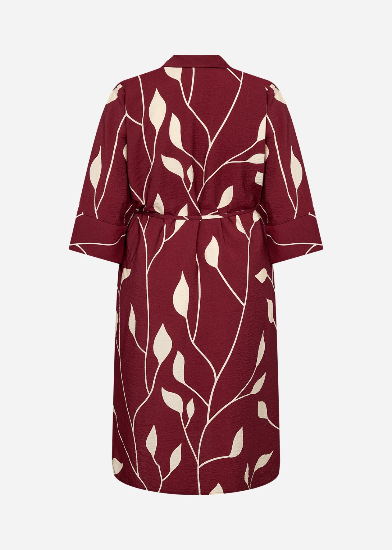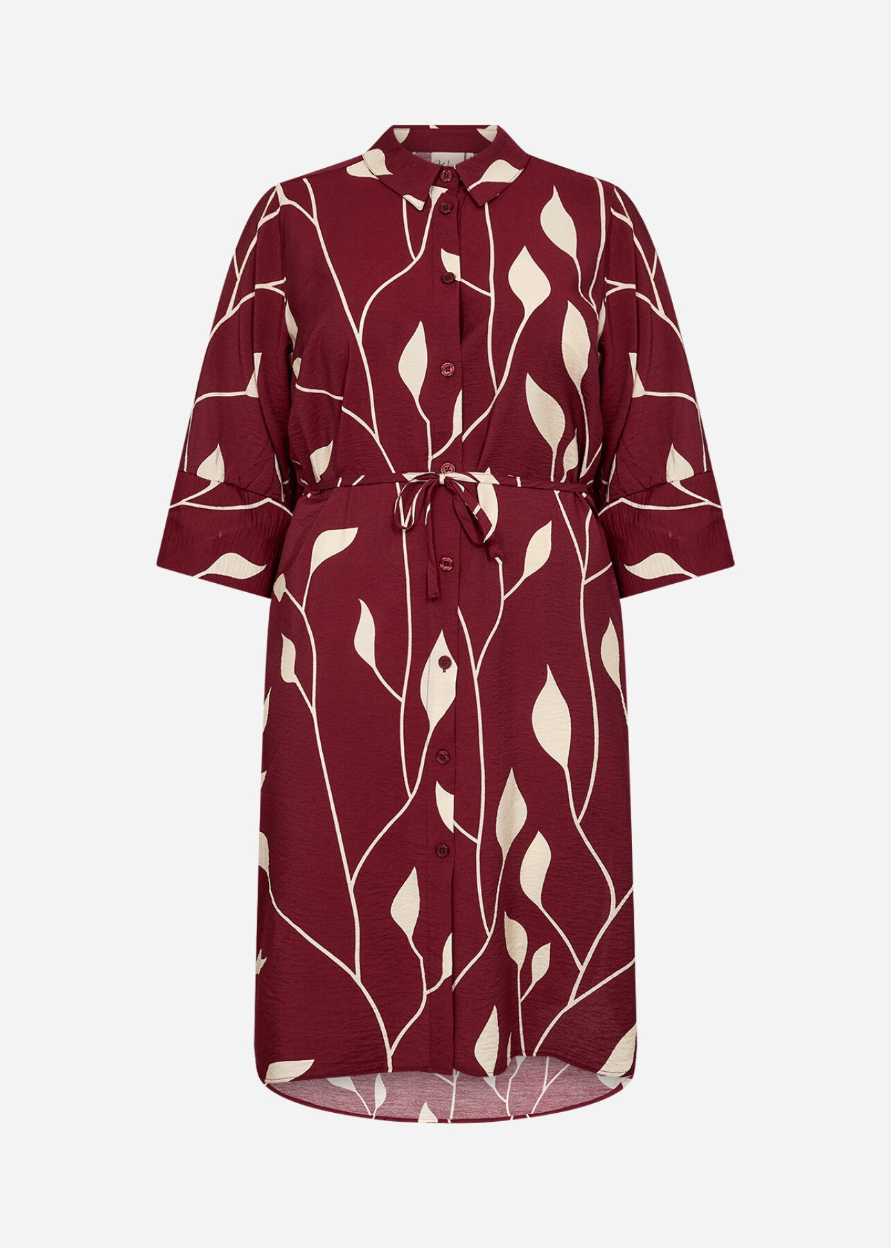 WA-NELLY 3 Dress är tillverkad av 82% viskos, 18% polyamid. Den har en klassisk krage, knappslå framtill och ett bälte i midjan. Den är skuren vid knäna och prydd med ett elegant bladtryck. Kombinera med enkla accessoarer och en snygg klack för en sofistikerad look.