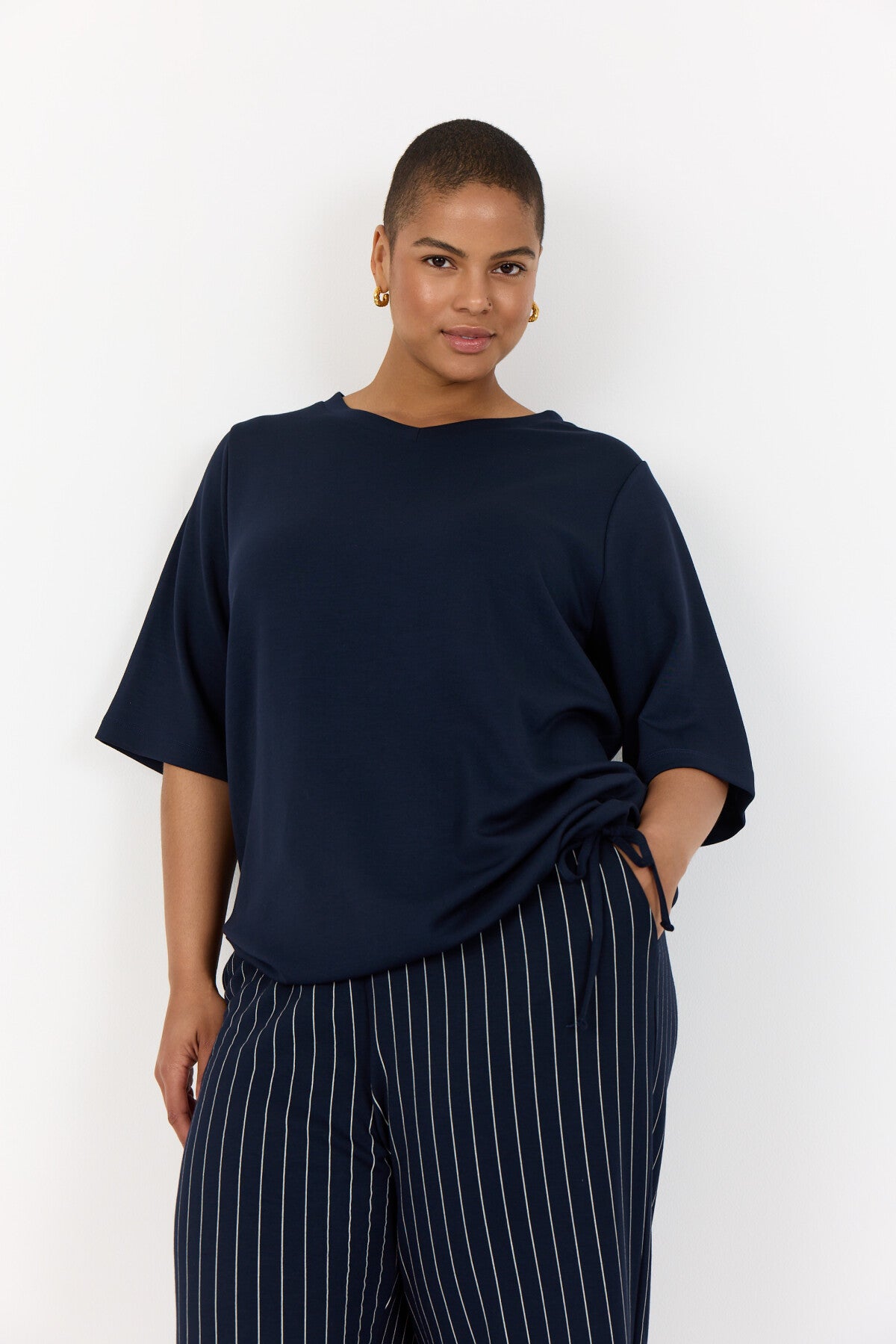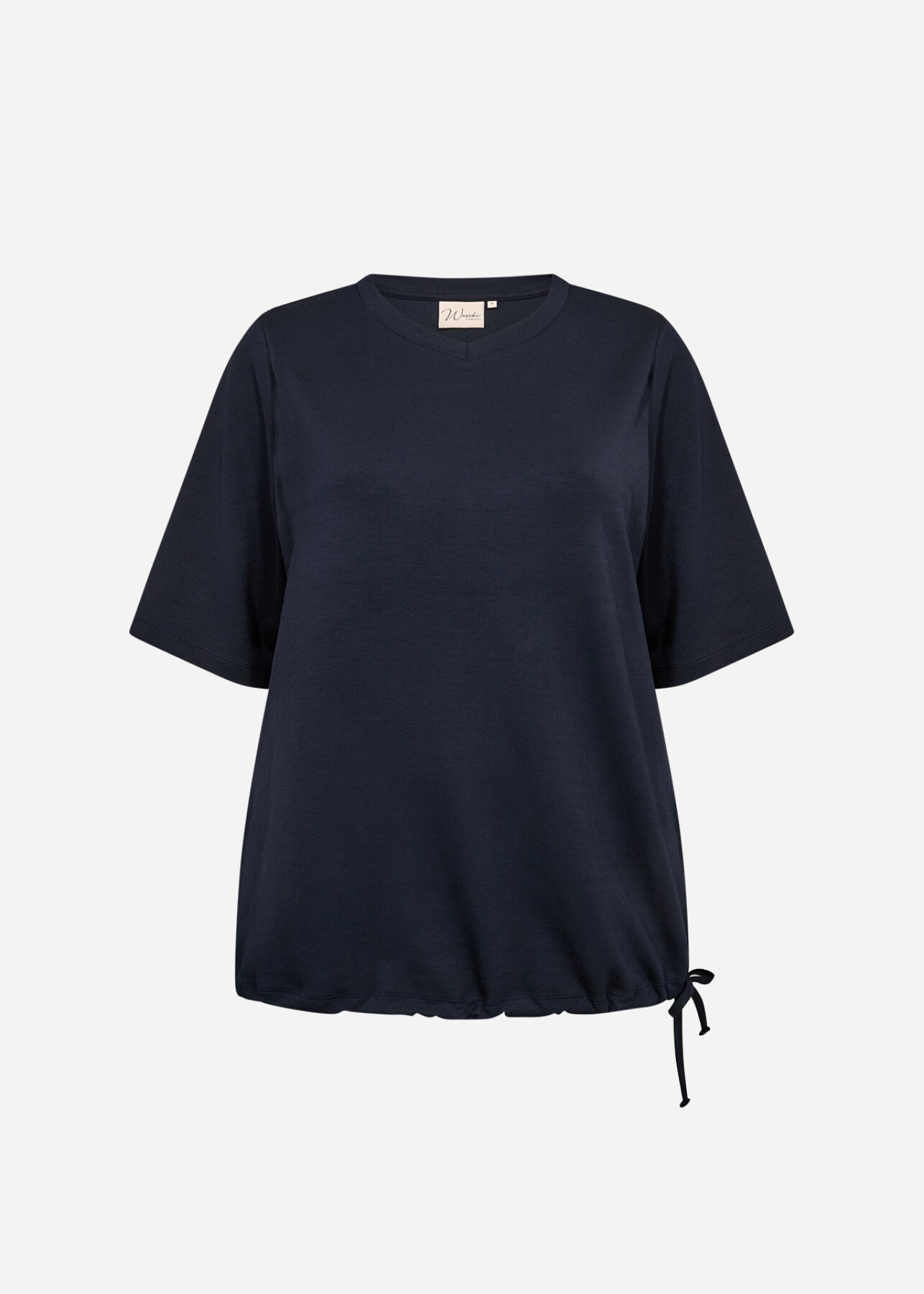 WA-SABINA 50 är en T-shirt tillverkad av 48% modal, 48% polyester och 4% elastan. Den har en V-ringning, korta ärmar och en justerbar dragsko i nederkanten för en anpassningsbar passform. Kombinera den med jeans och sneakers för en bekväm vardagslook.
