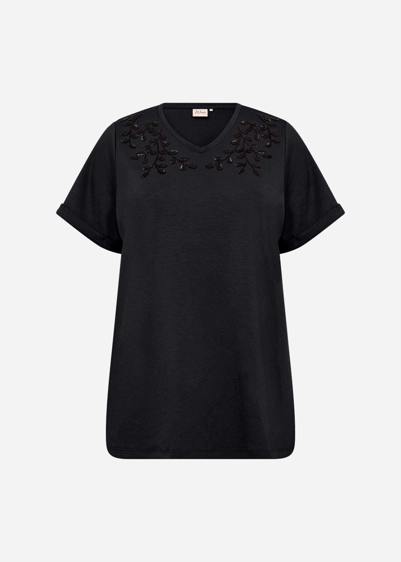 WA-SABINA 68 är en T-shirt tillverkad av 48% modal, 48% polyester, 4% elastan. Denna eleganta design har en V-ringning, upprullade korta ärmar och detaljerat broderi på axlarna. Matcha den med skräddarsydda byxor för en sofistikerad look eller jeans för en avslappnad stil.
