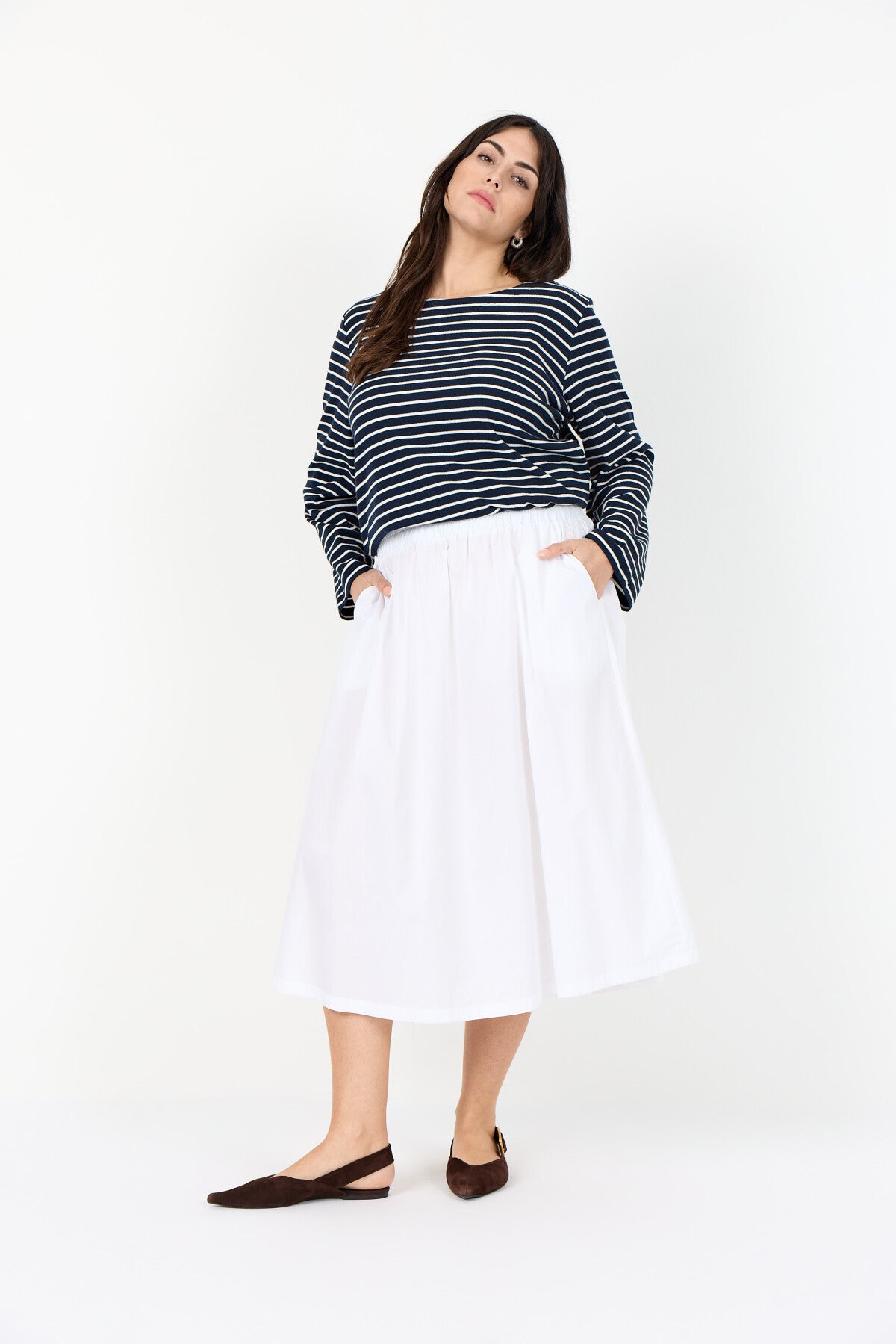 WA-SAKAR 2 är en härlig T-shirt tillverkad av 65% återvunnen bomull, 30% LENZING™ ECOVERO™ viskos och 5% elastan. Den har en klassisk båthals, långa ärmar och ett tidlöst randigt mönster. Matcha med jeans eller kjol för en elegant och cool look.