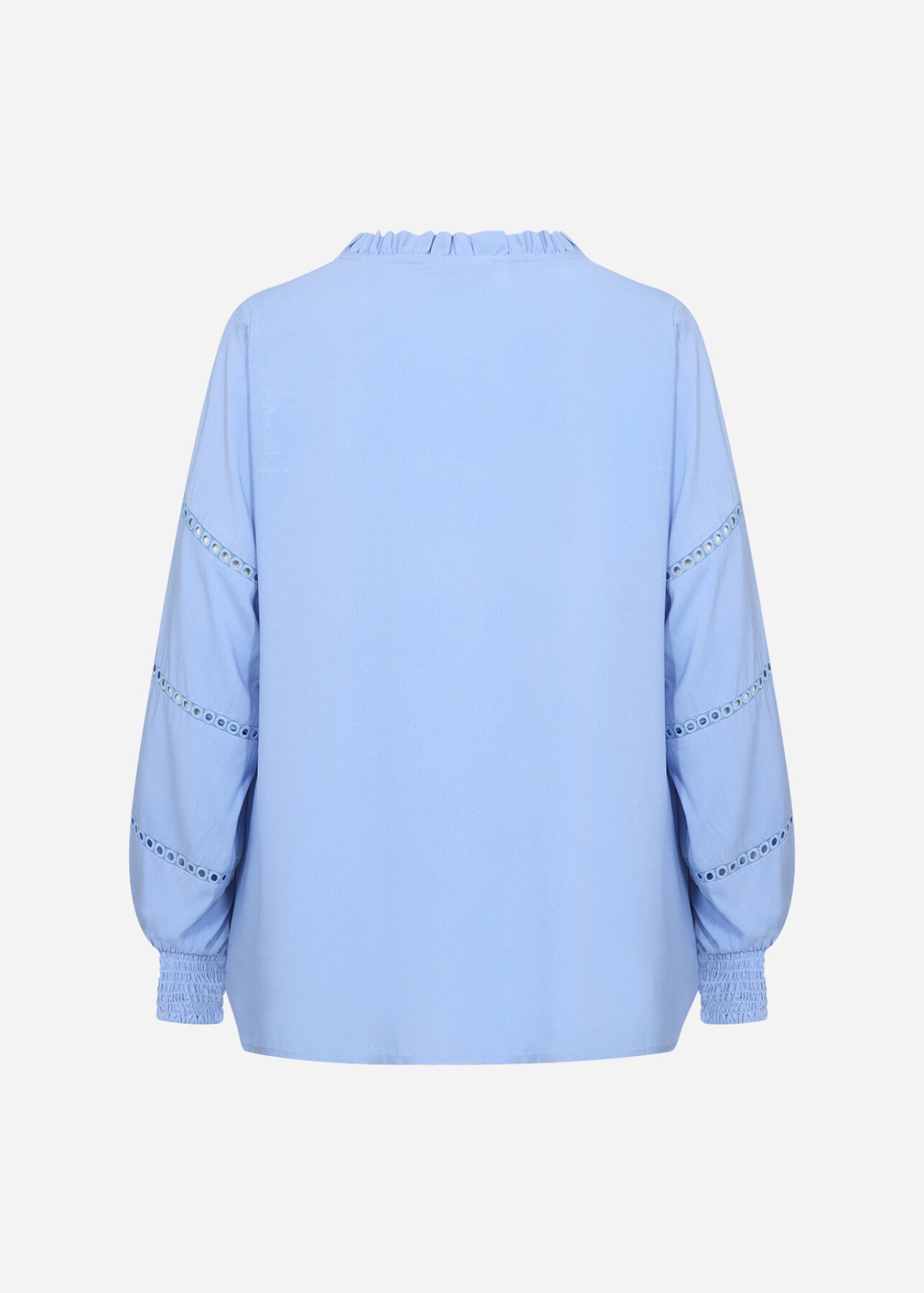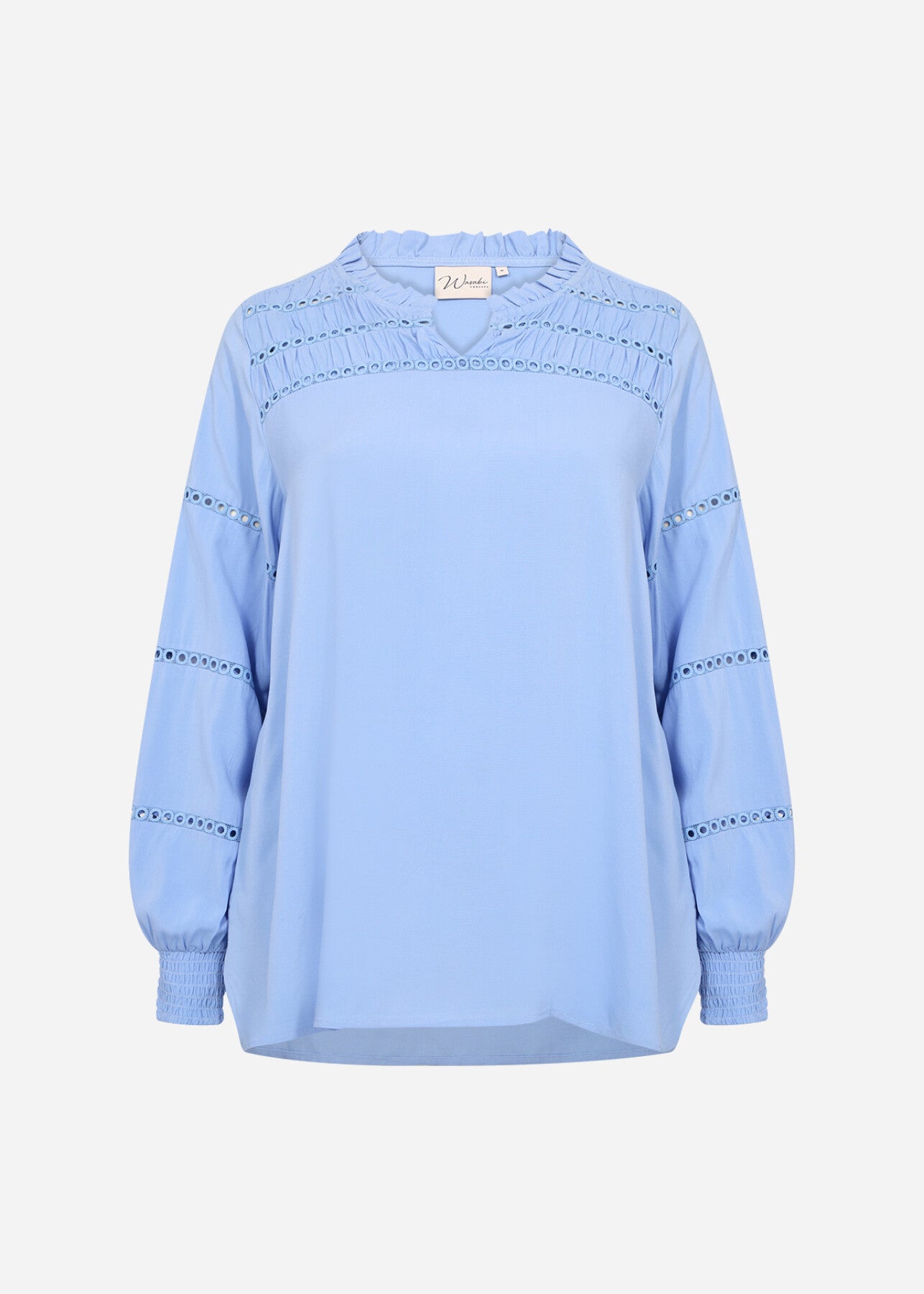 WA-SIA 32 är en blus tillverkad av 100% LENZING™ ECOVERO™ viskos. Den har en fin volangkrage med diskret v-ringning, öljettdetaljer och långa ärmar med rynkade manschetter. Kombinera den med skräddarsydda byxor för en sofistikerad look eller jeans för en avslappnad stil.
