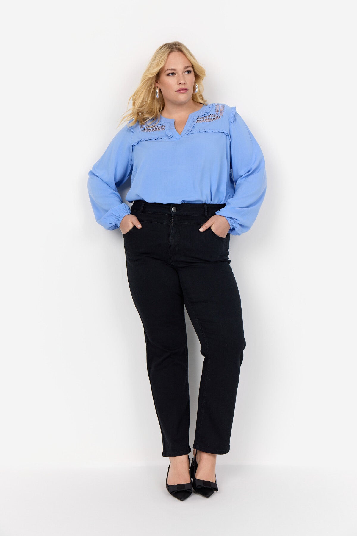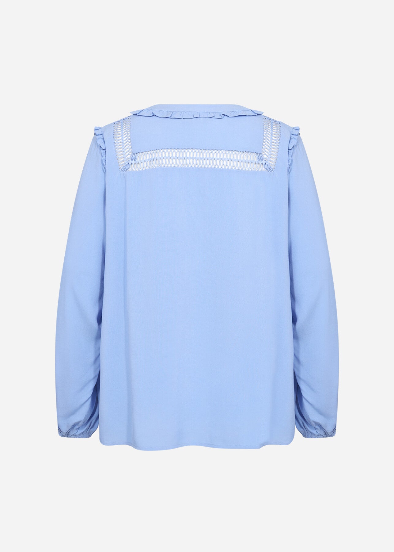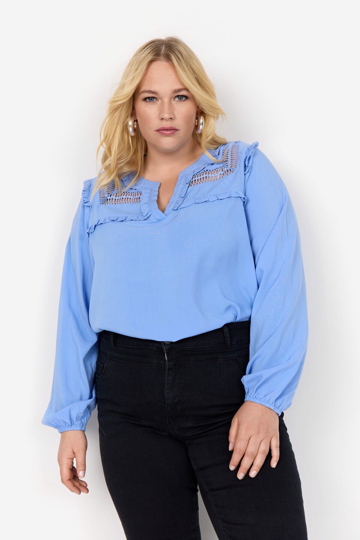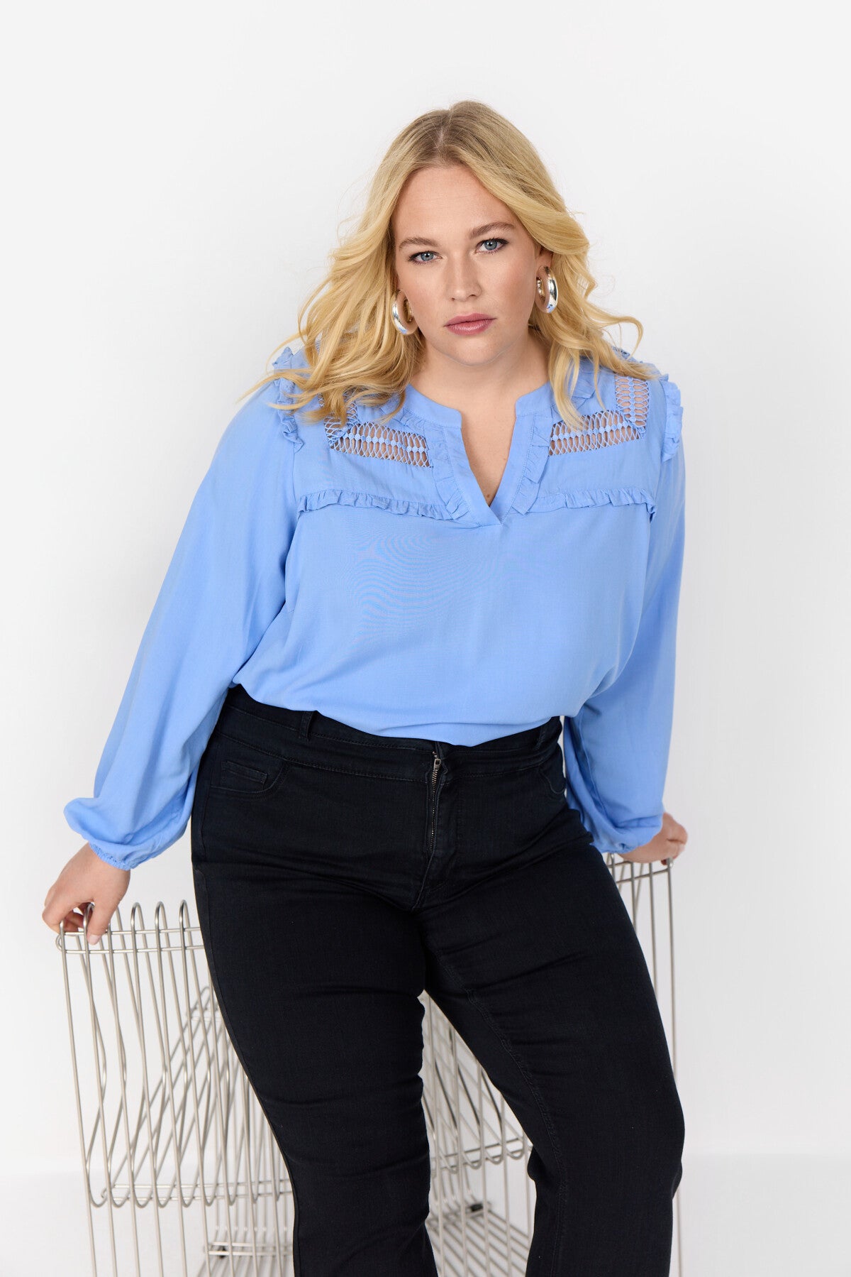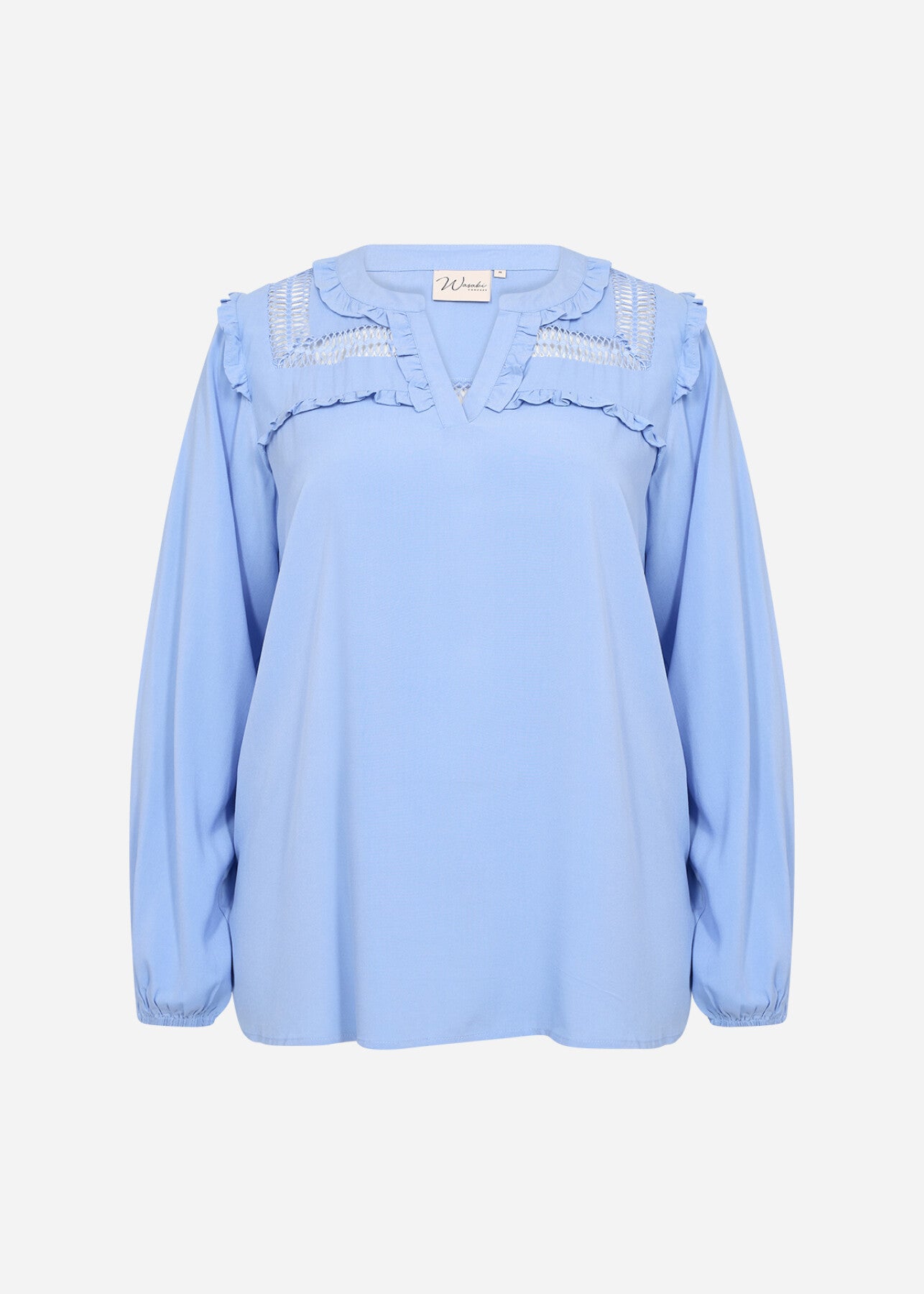 WA-SIA 33 är en blus tillverkad av 100% LENZING™ ECOVERO™ viskos. Blusen har fina spets- och volangdetaljer över axlarna, elastiska muddar och en fin V-ringning. Kombinera den med skräddarsydda byxor eller en ledig kjol för olika tillfällen.