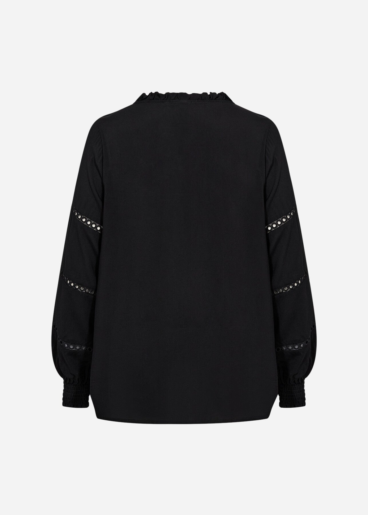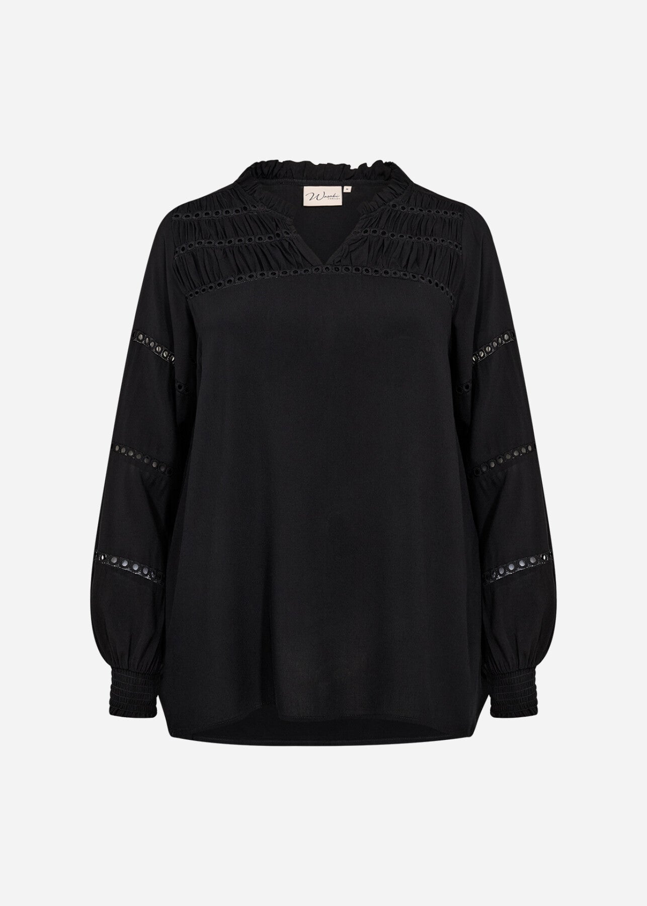 WA-SIA 32 är en blus tillverkad av 100% LENZING™ ECOVERO™ viskos. Den har en fin volangkrage med diskret v-ringning, öljettdetaljer och långa ärmar med rynkade manschetter. Kombinera den med skräddarsydda byxor för en sofistikerad look eller jeans för en avslappnad stil.