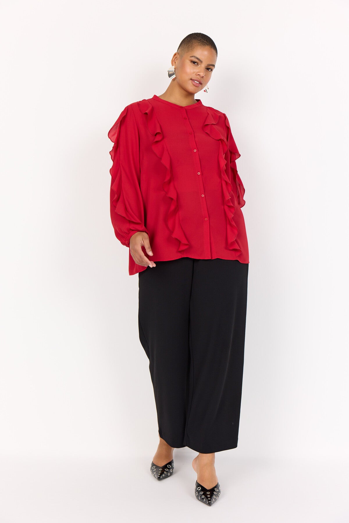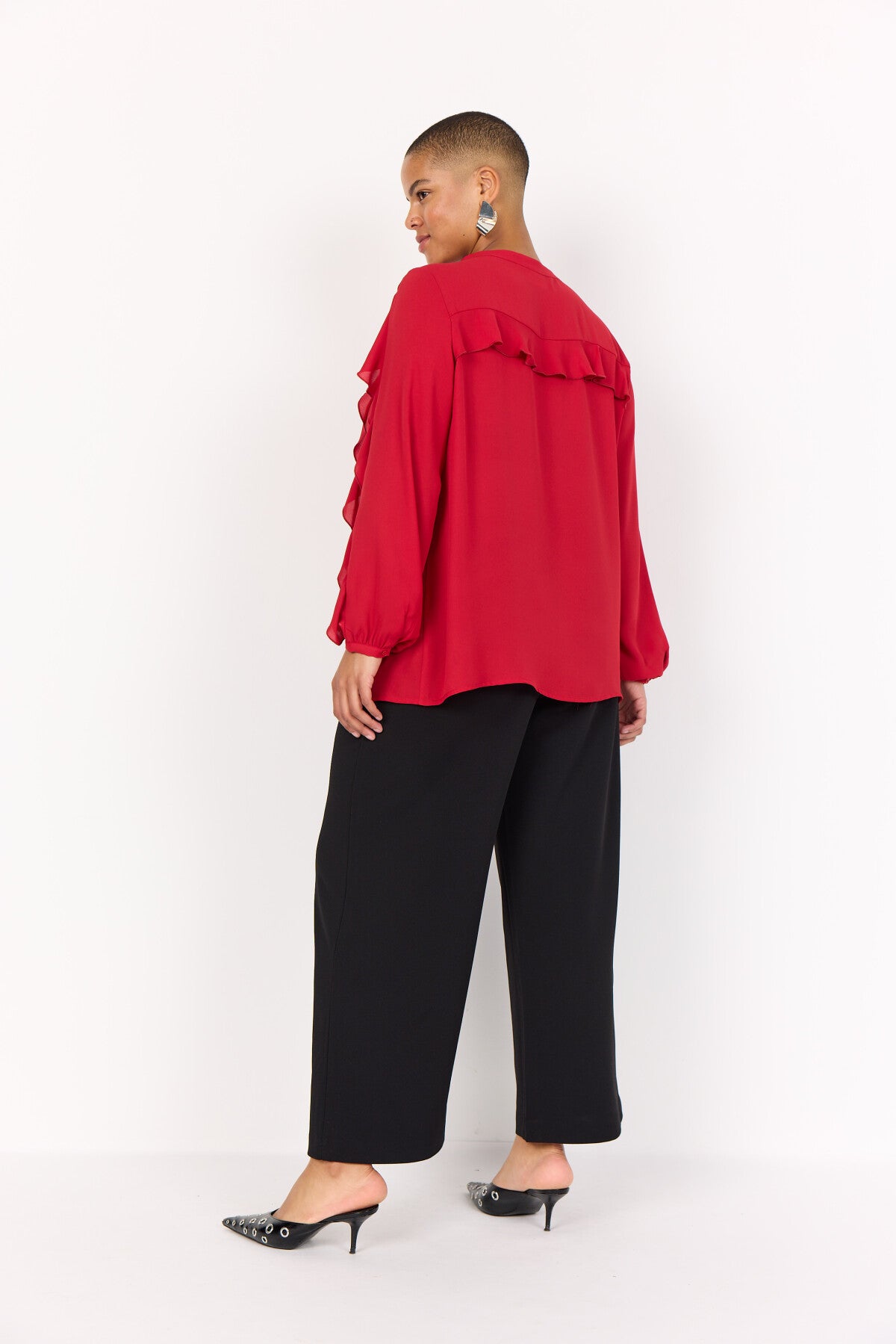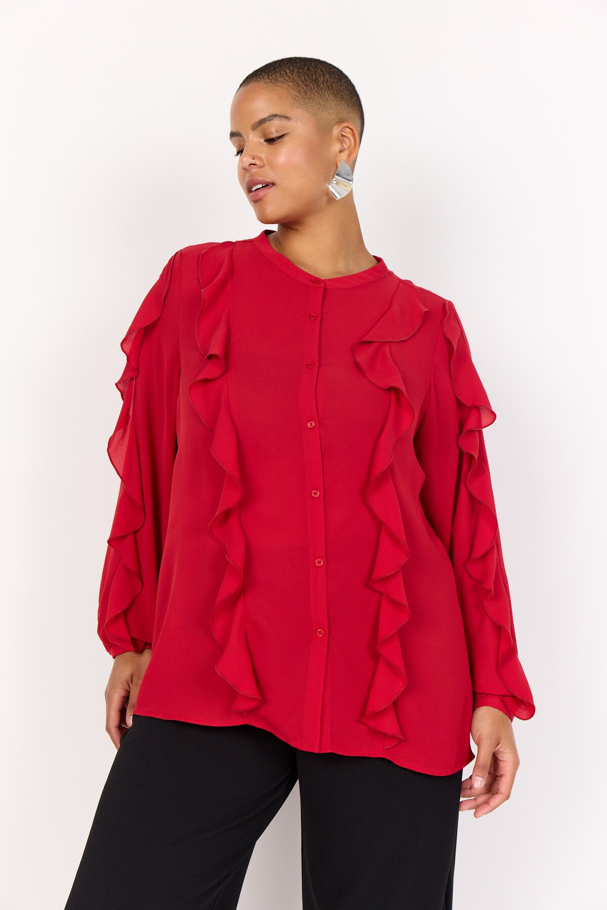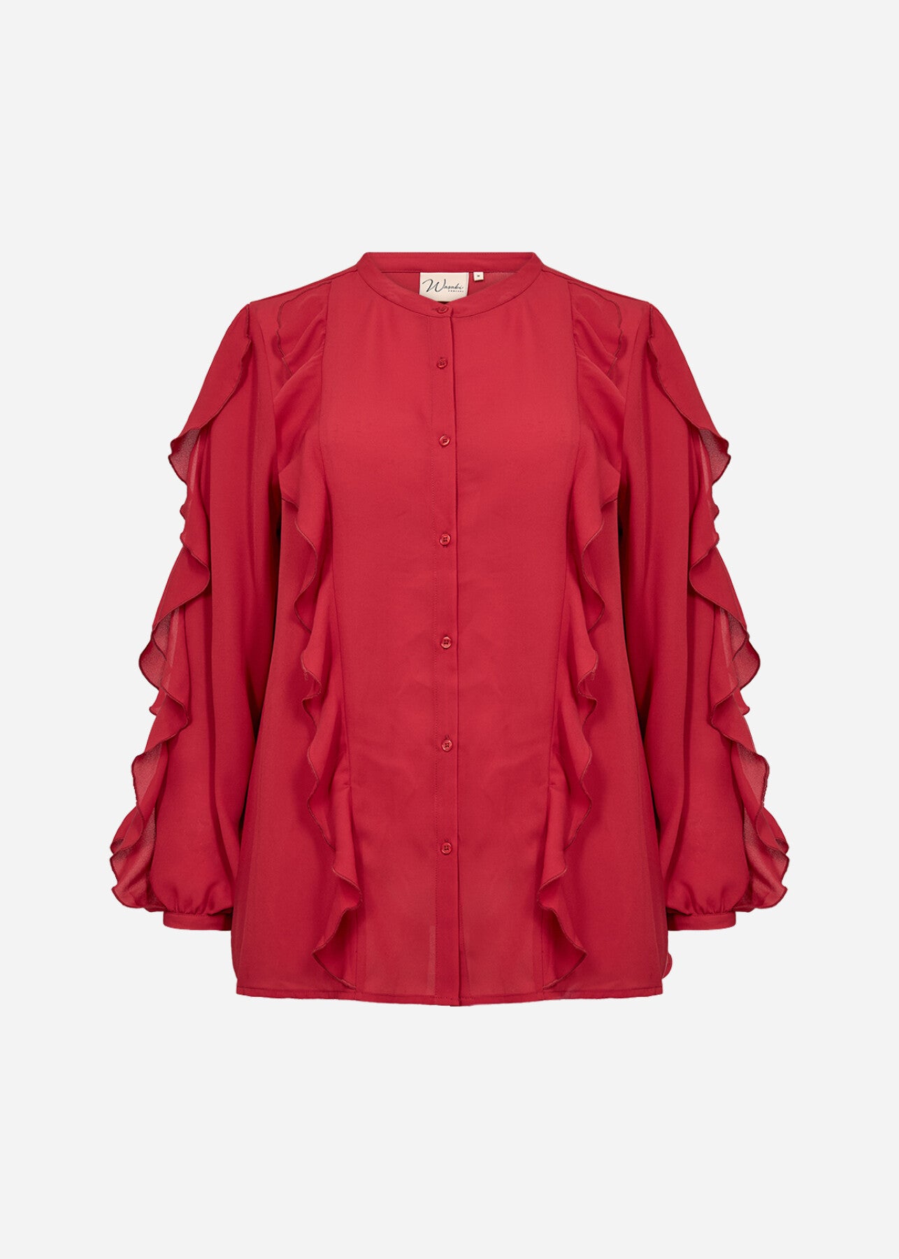 WA-THERESE 7 Blouse är tillverkad av 100% återvunnen polyester. Den har fina volangdetaljer, knappslå framtill och långa ärmar med rundad halsringning. Denna eleganta blus passar bra till skräddarsydda byxor eller en snygg kjol för alla tillfällen.